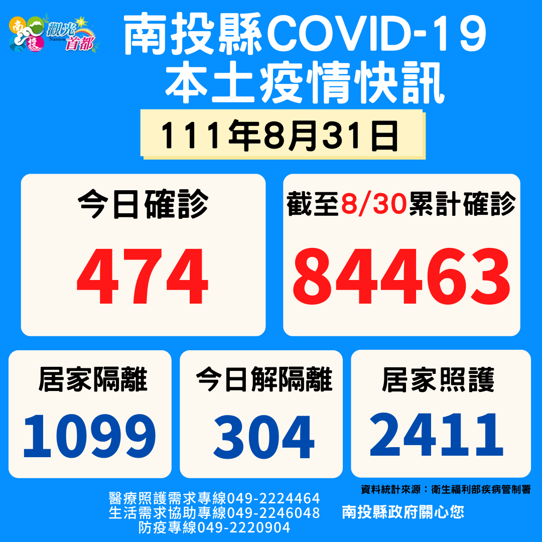 防疫宣傳 居家照護關懷手冊 防疫補助 勞工紓困 農漁畜牧 觀光紓困 企業紓困 租稅紓困 藝文紓困 中央各部會防疫專區 首頁 防疫宣傳 8月31日南投縣疫情... 8月31日南投縣疫情快訊 公佈單位:新聞及行政處 發佈日期:111/9/1