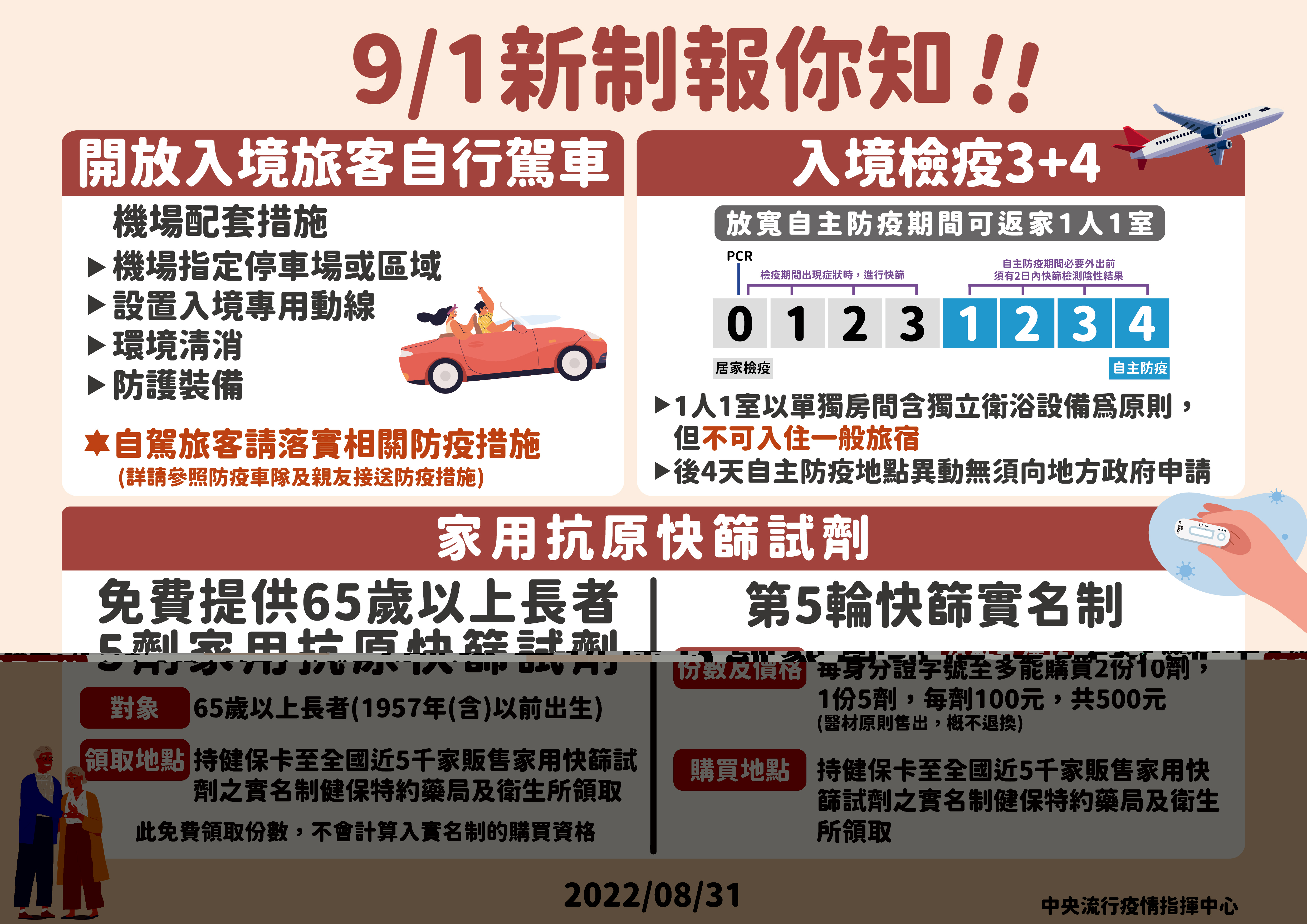 南投縣衛生局長陳南松表示,今(9/1)起多項防疫新政策上路,包含:(一)入境檢疫3+4,放寬自主防疫可返家1人1室,變更地點無須向地方政府提出申請;(二)開放入境旅客可自行駕車,不得以租車方式駕車;(三)65歲以上長者(46年次)可持健保卡至實名制健保特約藥局及衛生所免費領取5劑家用抗原快篩試劑;(四)開放第5輪實名制購買快篩試劑,每身分證號至多買2份10劑。