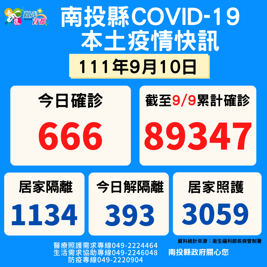 防疫宣傳 居家照護關懷手冊 防疫補助 勞工紓困 農漁畜牧 觀光紓困 企業紓困 租稅紓困 藝文紓困 中央各部會防疫專區 首頁 防疫宣傳 9/10南投縣疫情快... 9/10南投縣疫情快訊 公佈單位:新聞及行政處 發佈日期:111/9/11