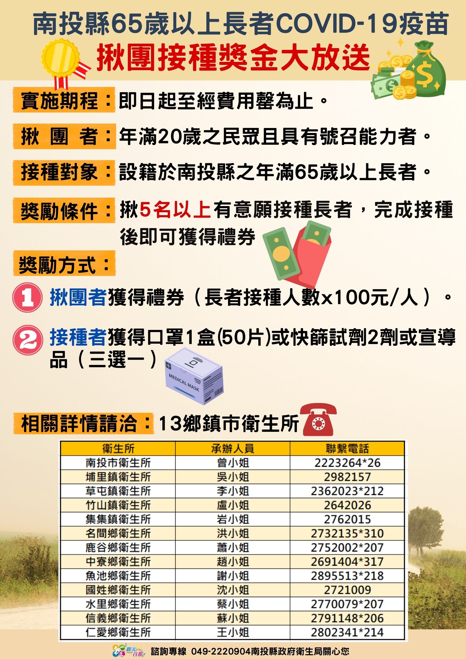 陳南松局長表示,南投縣衛生局為鼓勵長者接種COVID-19疫苗,亦推出「揪團接種獎金大放送」活動,針對南投縣65歲以上長者接種疫苗,揪團者只要揪滿5人以上,即可獲得獎勵禮券;為提升6個月以上嬰幼童新冠疫苗接種率,祭出「打疫苗,送口罩」大放送,凡符合資格接種者皆可免費獲得1盒(包)口罩。相關接種資訊可至各合約院所或衛生局官網新冠肺炎專區查詢:https://reurl.cc/eOdA2W。提醒民眾在前往合約院所施打疫苗前,先以電話確認,並記得攜帶接種者健保卡、疫苗接種黃卡就近至本縣合約院所或鄉鎮衛生所施打。