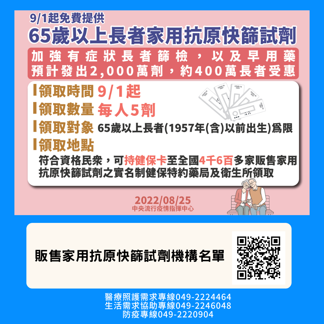 防疫宣傳 居家照護關懷手冊 防疫補助 勞工紓困 農漁畜牧 觀光紓困 企業紓困 租稅紓困 藝文紓困 中央各部會防疫專區 首頁 防疫宣傳 9月1日起免費提供 ... 9月1日起免費提供 65歲以上長者家用抗原快篩試劑 公佈單位:新聞及行政處 發佈日期:111/9/20