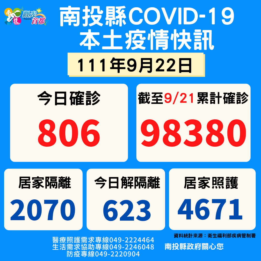 防疫宣傳 居家照護關懷手冊 防疫補助 勞工紓困 農漁畜牧 觀光紓困 企業紓困 租稅紓困 藝文紓困 中央各部會防疫專區 首頁 防疫宣傳 9/22南投縣疫情快... 9/22南投縣疫情快訊 公佈單位:新聞及行政處 發佈日期:111/9/22