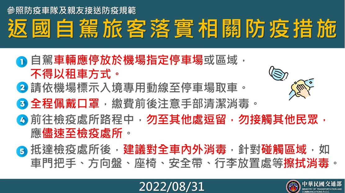 防疫宣傳 居家照護關懷手冊 防疫補助 勞工紓困 農漁畜牧 觀光紓困 企業紓困 租稅紓困 藝文紓困 中央各部會防疫專區 首頁 防疫宣傳 返國自駕旅客落實相關... 返國自駕旅客落實相關防疫措施 公佈單位:新聞及行政處 發佈日期:111/9/23
