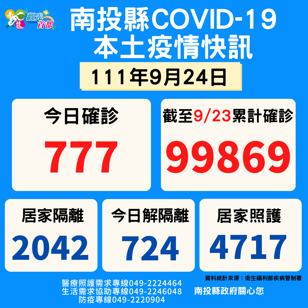防疫宣傳 居家照護關懷手冊 防疫補助 勞工紓困 農漁畜牧 觀光紓困 企業紓困 租稅紓困 藝文紓困 中央各部會防疫專區 首頁 防疫宣傳 9/24南投縣疫情快... 9/24南投縣疫情快訊 公佈單位:新聞及行政處 發佈日期:111/9/24