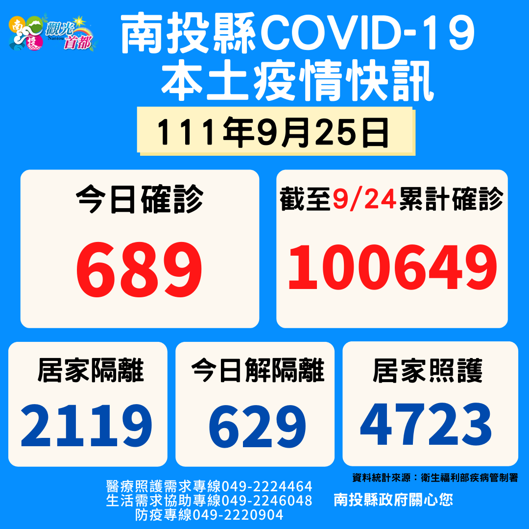 防疫宣傳 居家照護關懷手冊 防疫補助 勞工紓困 農漁畜牧 觀光紓困 企業紓困 租稅紓困 藝文紓困 中央各部會防疫專區 首頁 防疫宣傳 9/25南投縣疫情快... 9/25南投縣疫情快訊 公佈單位:新聞及行政處 發佈日期:111/9/25