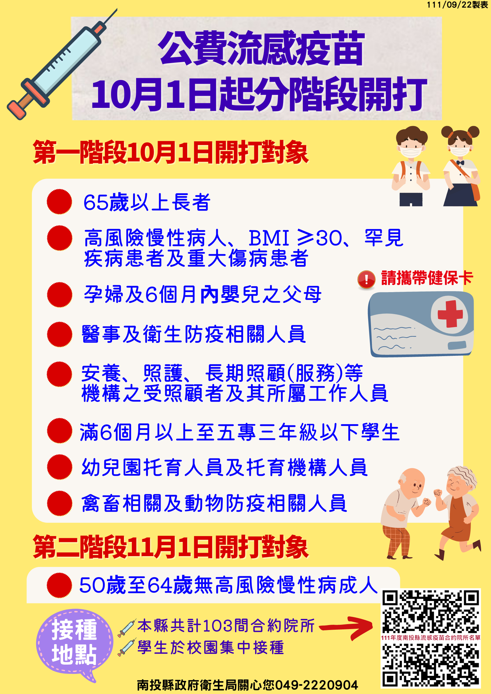 防疫宣傳 居家照護關懷手冊 防疫補助 勞工紓困 農漁畜牧 觀光紓困 企業紓困 租稅紓困 藝文紓困 中央各部會防疫專區 首頁 防疫宣傳 南投縣流感疫苗10月... 南投縣流感疫苗10月1日起開打 公佈單位:新聞及行政處 發佈日期:111/9/27
