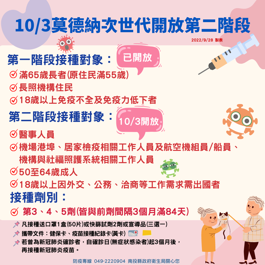 防疫宣傳 居家照護關懷手冊 防疫補助 勞工紓困 農漁畜牧 觀光紓困 企業紓困 租稅紓困 藝文紓困 中央各部會防疫專區 首頁 防疫宣傳 10/3莫德納次世代... 10/3莫德納次世代開放第二階段 公佈單位:新聞及行政處 發佈日期:111/10/2