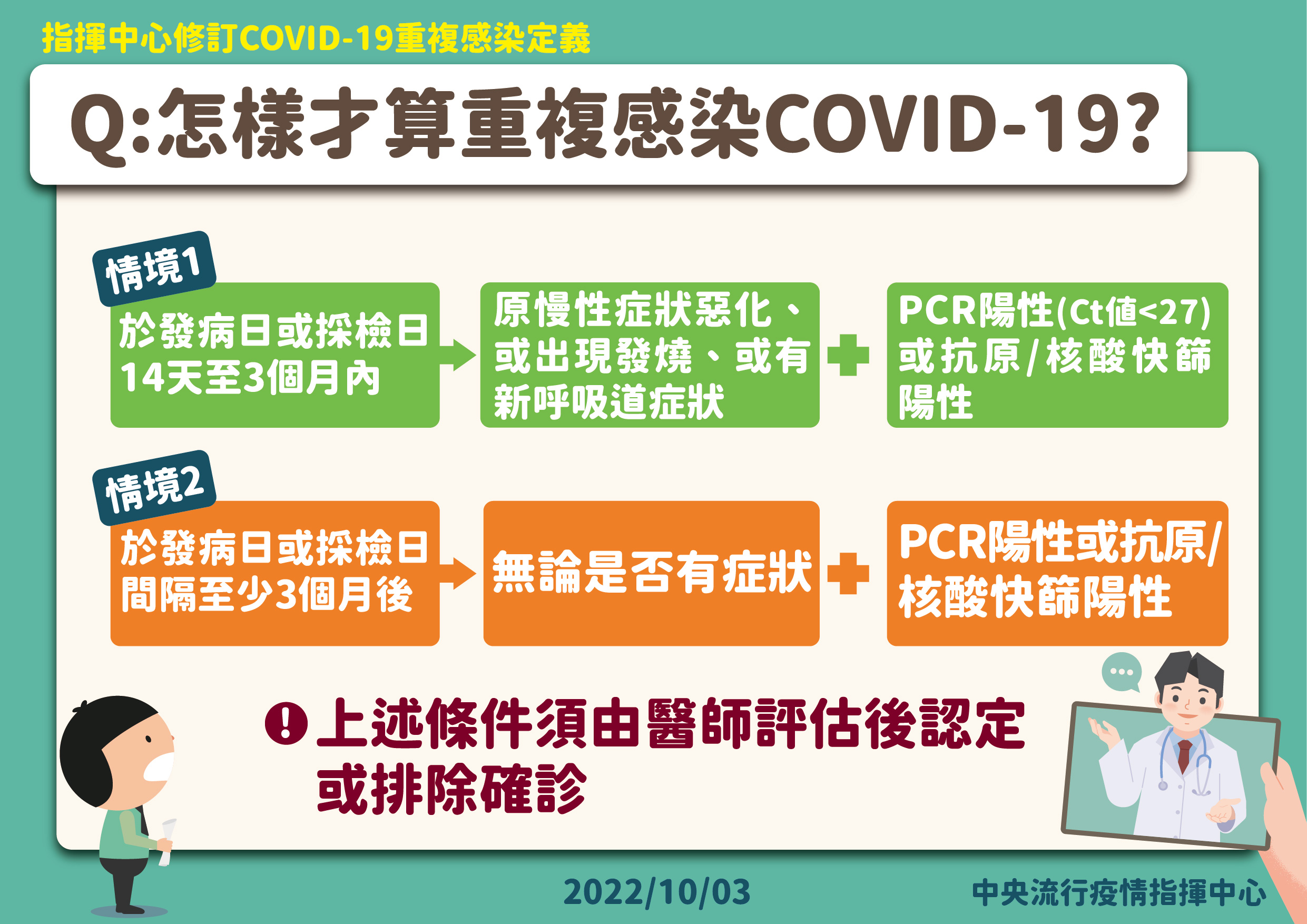 衛生局說昨(10/3)中央流行疫情指揮中心再修訂「COVID-19重複感染(reinfection)定義及個案處置原則」,放寬為14天至3個月內,原慢性症狀惡化、出現發燒或有新呼吸道症狀,以及PCR陽性(CT<27)或抗原/核酸快篩陽性,經醫師判斷為重複感染者,即依現行確診病例處理原則,啟動相關防疫措施及醫療處置。