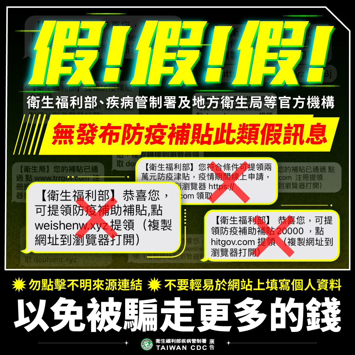 衛生局局長陳南松再次提醒,目前衛生福利部、疾病管制署、地方衛生局等等機關都不會主動發簡訊要民眾提領防疫補貼,請小心來源不明的郵件、簡訊、或是通訊軟體訊息,不要點擊訊息中的連結或是複製網址前往釣魚網站輸入個資,以免個人資料遭盜用。
