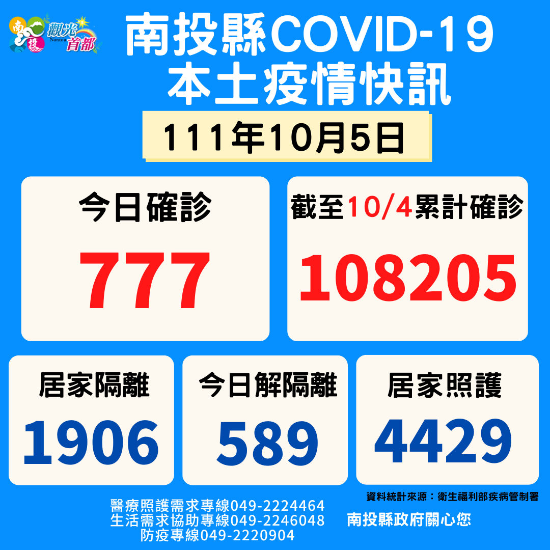 防疫宣傳 居家照護關懷手冊 防疫補助 勞工紓困 農漁畜牧 觀光紓困 企業紓困 租稅紓困 藝文紓困 中央各部會防疫專區 首頁 防疫宣傳 10/5南投縣疫情快... 10/5南投縣疫情快訊 公佈單位:新聞及行政處 發佈日期:111/10/5