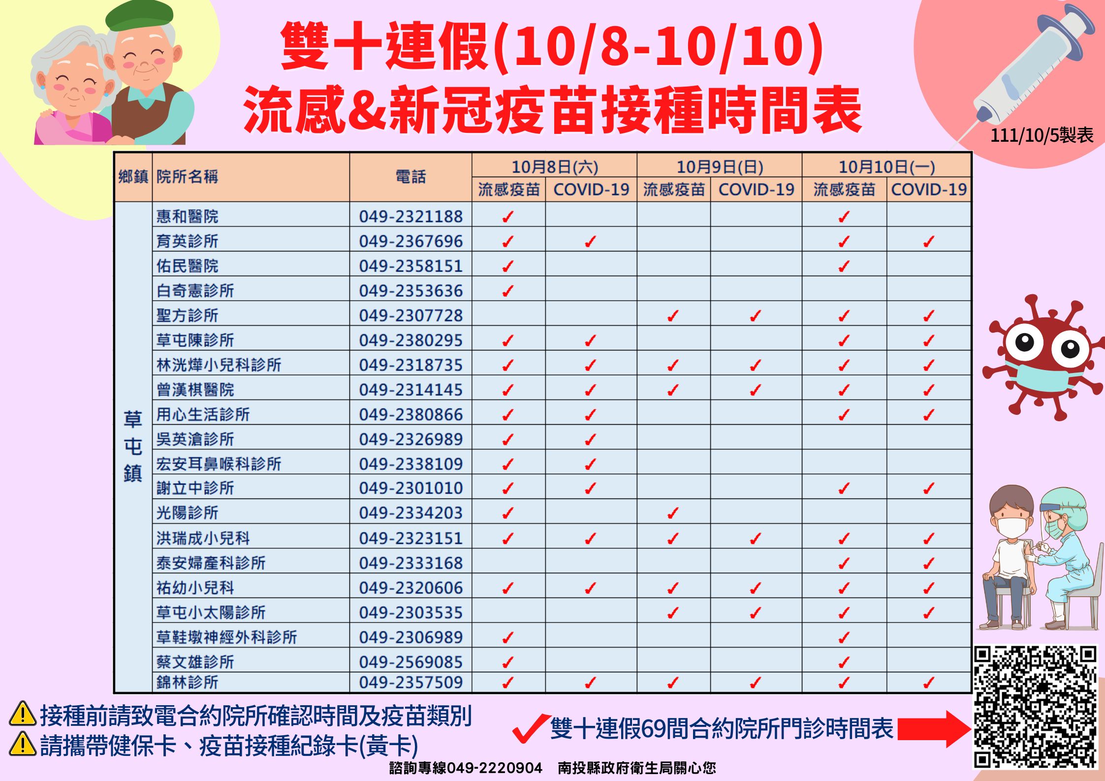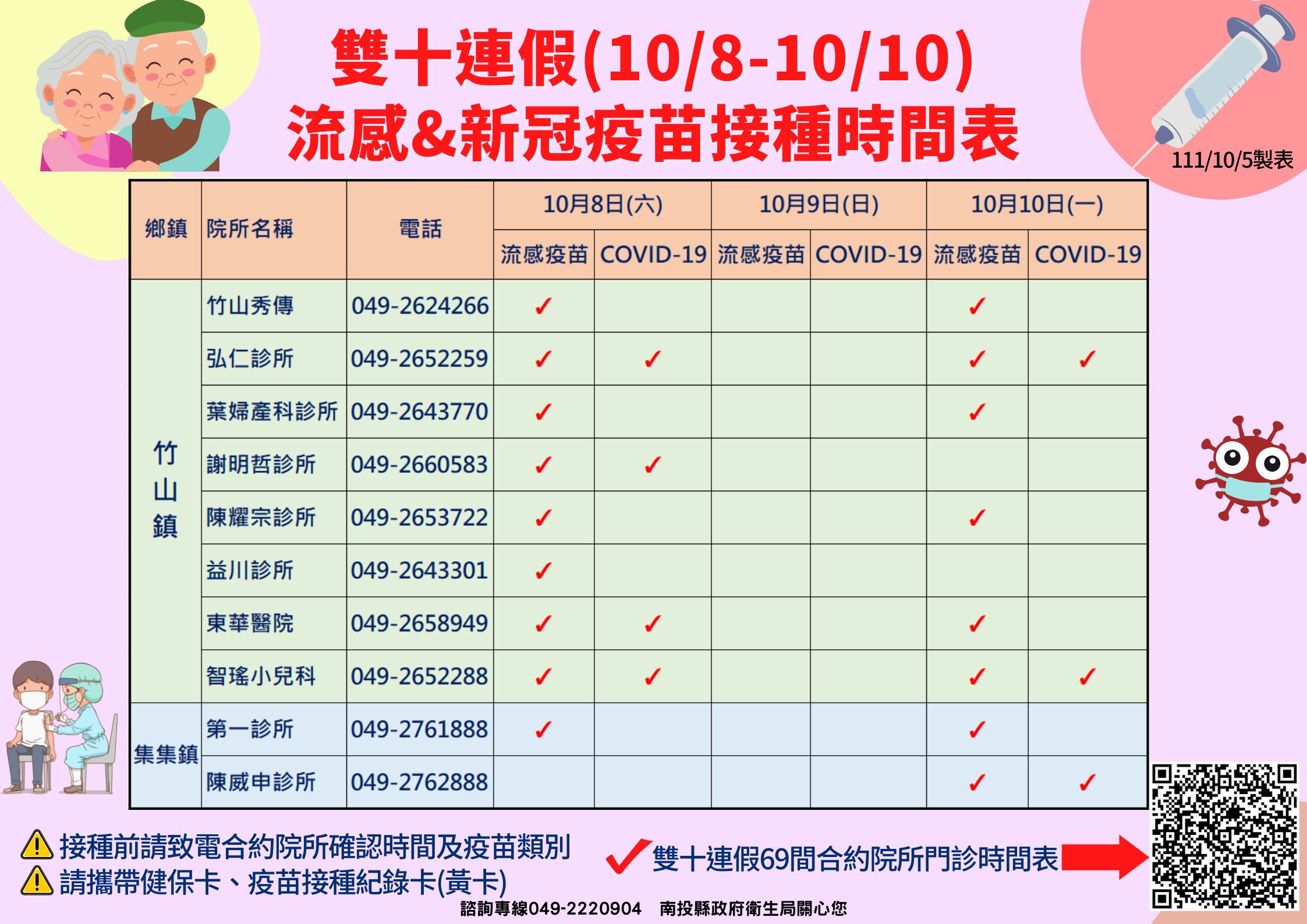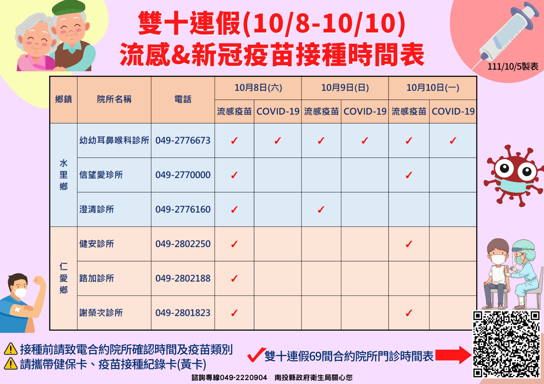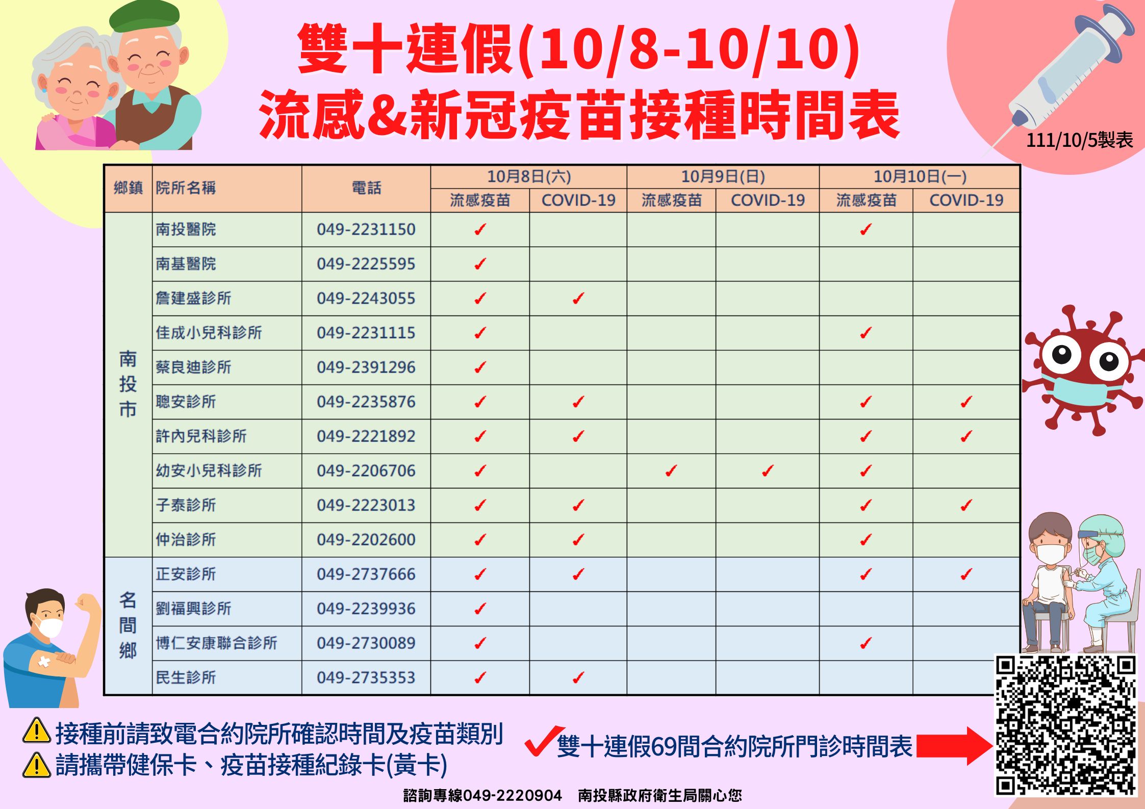 南投縣衛生局長陳南松表示,為照顧縣民健康,在雙十連假期間(10/8~10/11)提供便利的醫療服務,本週六(10/8)南投市、埔里鎮、草屯鎮與竹山鎮等4大鄉鎮將開設6個流感疫苗社區接種站,另外全縣共計有69家合約院所會在雙十連假提供流感疫苗及COVID-19疫苗接種服務,詳見:https://pse.is/4j3ljk。
