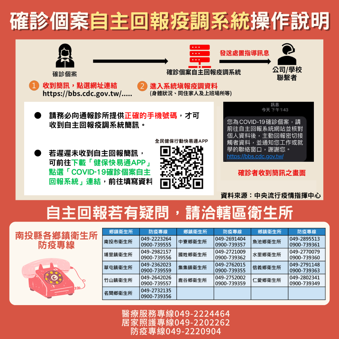 防疫宣傳 居家照護關懷手冊 防疫補助 勞工紓困 農漁畜牧 觀光紓困 企業紓困 租稅紓困 藝文紓困 中央各部會防疫專區 首頁 防疫宣傳 確診個案自主回報疫調... 確診個案自主回報疫調系統操作說明 公佈單位:新聞及行政處 發佈日期:111/10/12