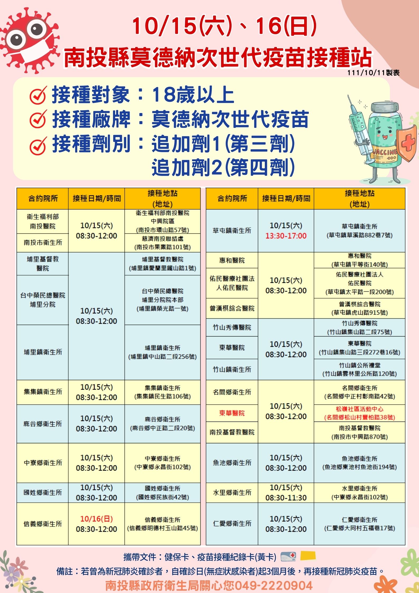 南投縣政府衛生局長陳南松表示,為提供18~49歲青壯年族群新冠疫苗有效防護力,南投縣於10月15(六)16(日)假日不休息,共開設51站次世代莫德納疫苗假日接種站,本次名間鄉有開設3站接種站(松嶺社區活動中心、南基醫院及名間鄉衛生所),歡迎名間鄉親善加利用。草屯鎮衛生所接種時間為10月15(六)下午1時~5時30分,另信義鄉衛生所接種時間則在10月16(日)上午8時30分~12時,請民眾注意各合約院所開放接種時段前往接種。
