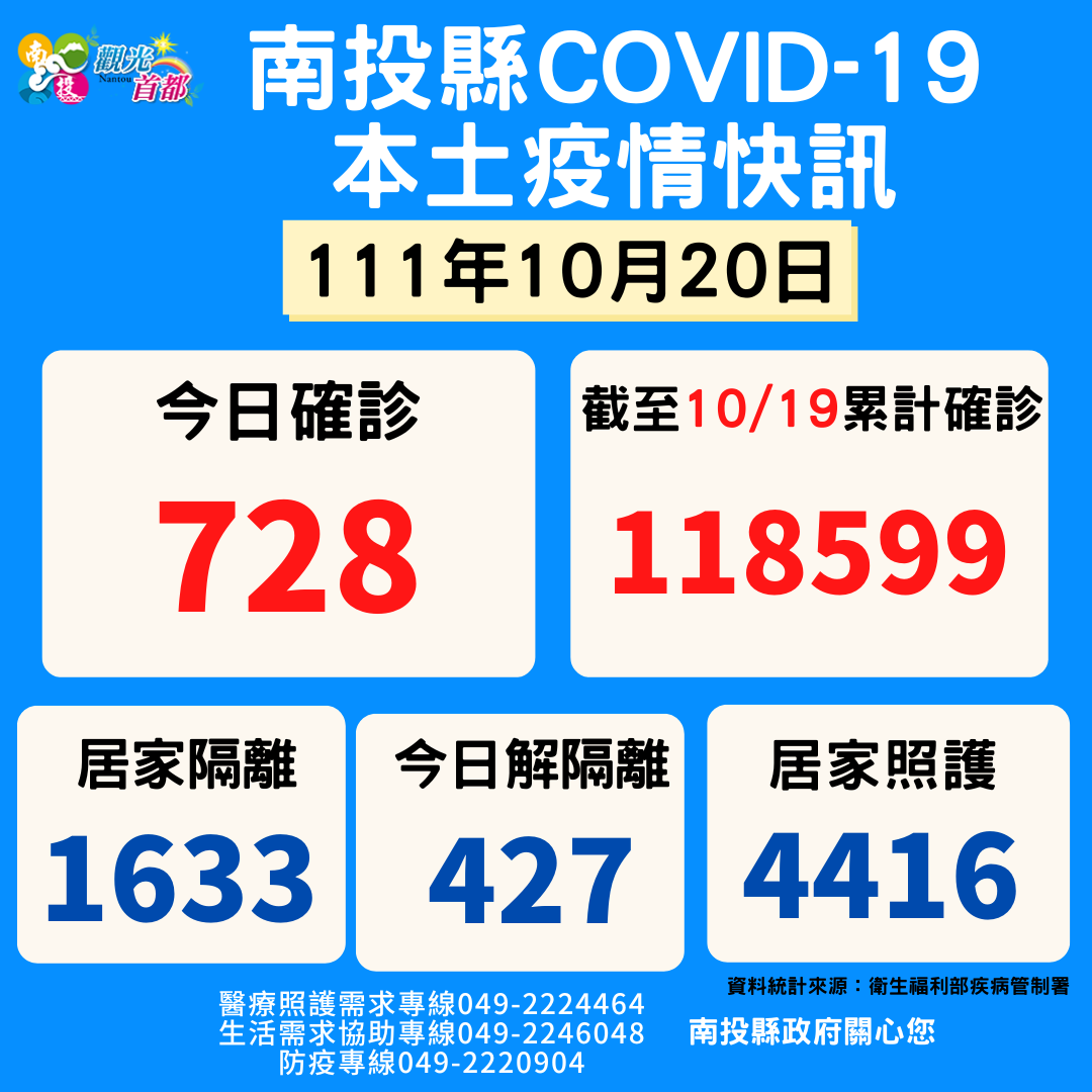 防疫宣傳 居家照護關懷手冊 防疫補助 勞工紓困 農漁畜牧 觀光紓困 企業紓困 租稅紓困 藝文紓困 中央各部會防疫專區 首頁 防疫宣傳 10月20日南投縣疫... 10月20日南投縣疫情快訊 公佈單位:新聞及行政處 發佈日期:111/10/20