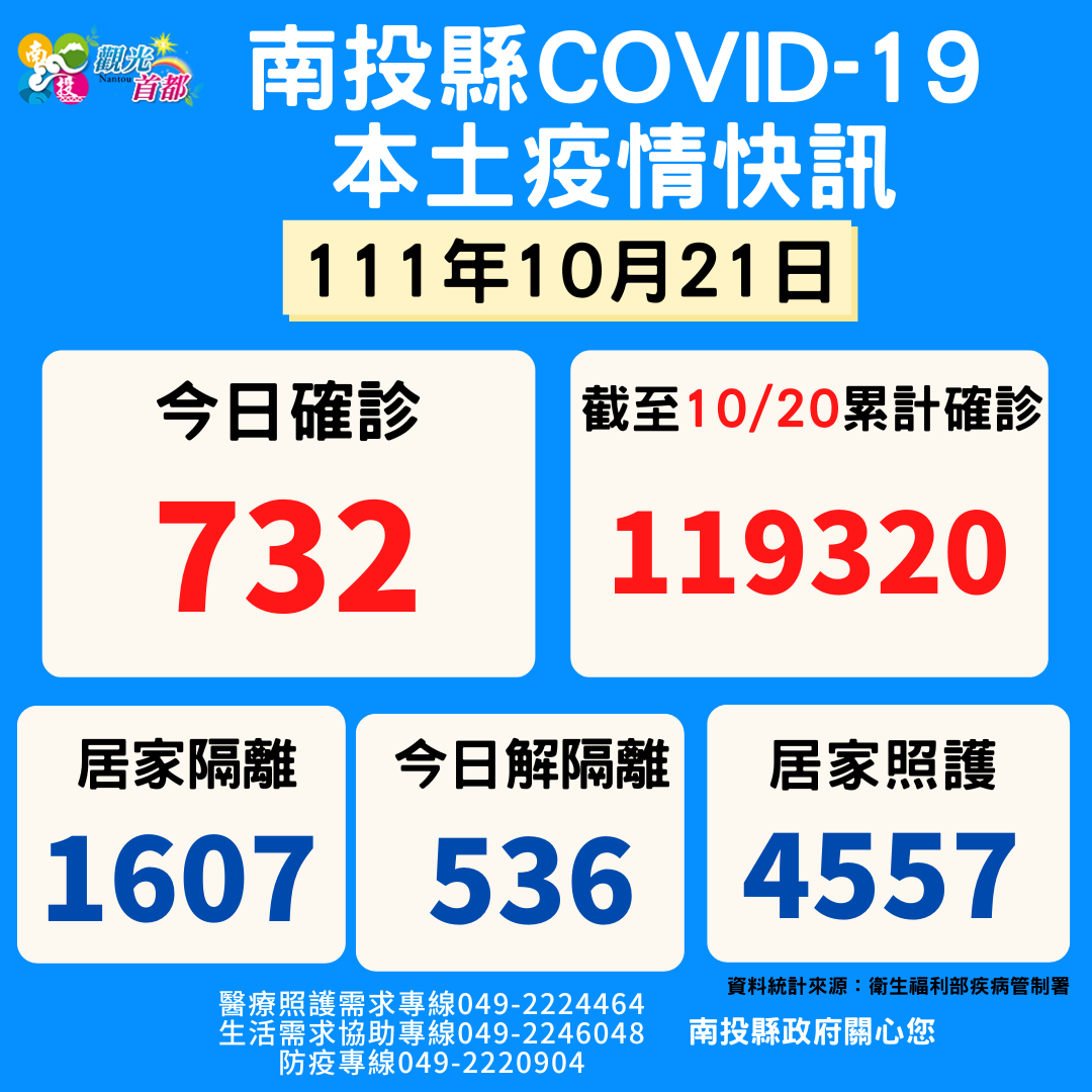 防疫宣傳 居家照護關懷手冊 防疫補助 勞工紓困 農漁畜牧 觀光紓困 企業紓困 租稅紓困 藝文紓困 中央各部會防疫專區 首頁 防疫宣傳 10月21日南投縣疫... 10月21日南投縣疫情快訊 公佈單位:新聞及行政處 發佈日期:111/10/21