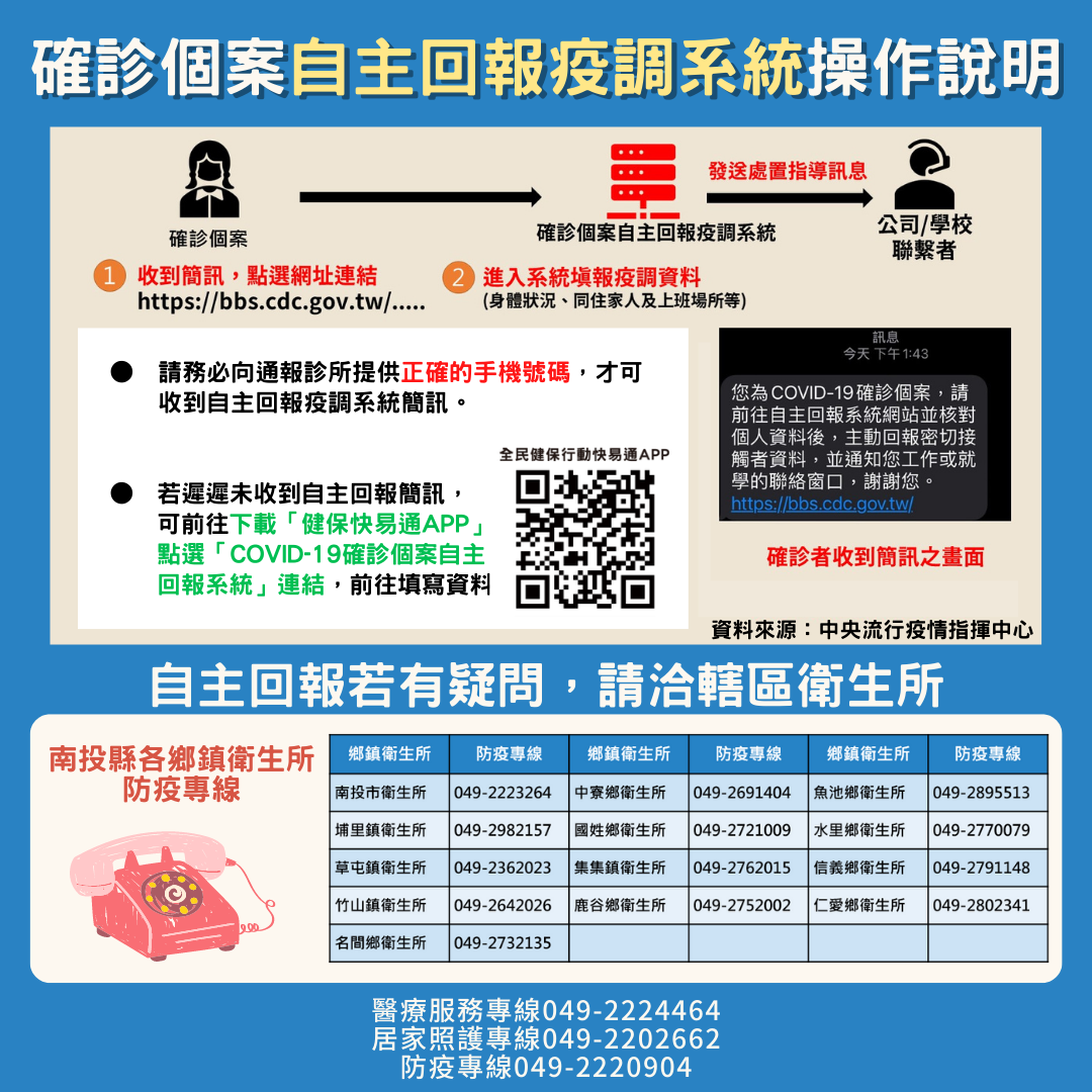 防疫宣傳 居家照護關懷手冊 防疫補助 勞工紓困 農漁畜牧 觀光紓困 企業紓困 租稅紓困 藝文紓困 中央各部會防疫專區 首頁 防疫宣傳 確診個案自主回報疫調... 確診個案自主回報疫調系統操作說明 公佈單位:新聞及行政處 發佈日期:111/10/24