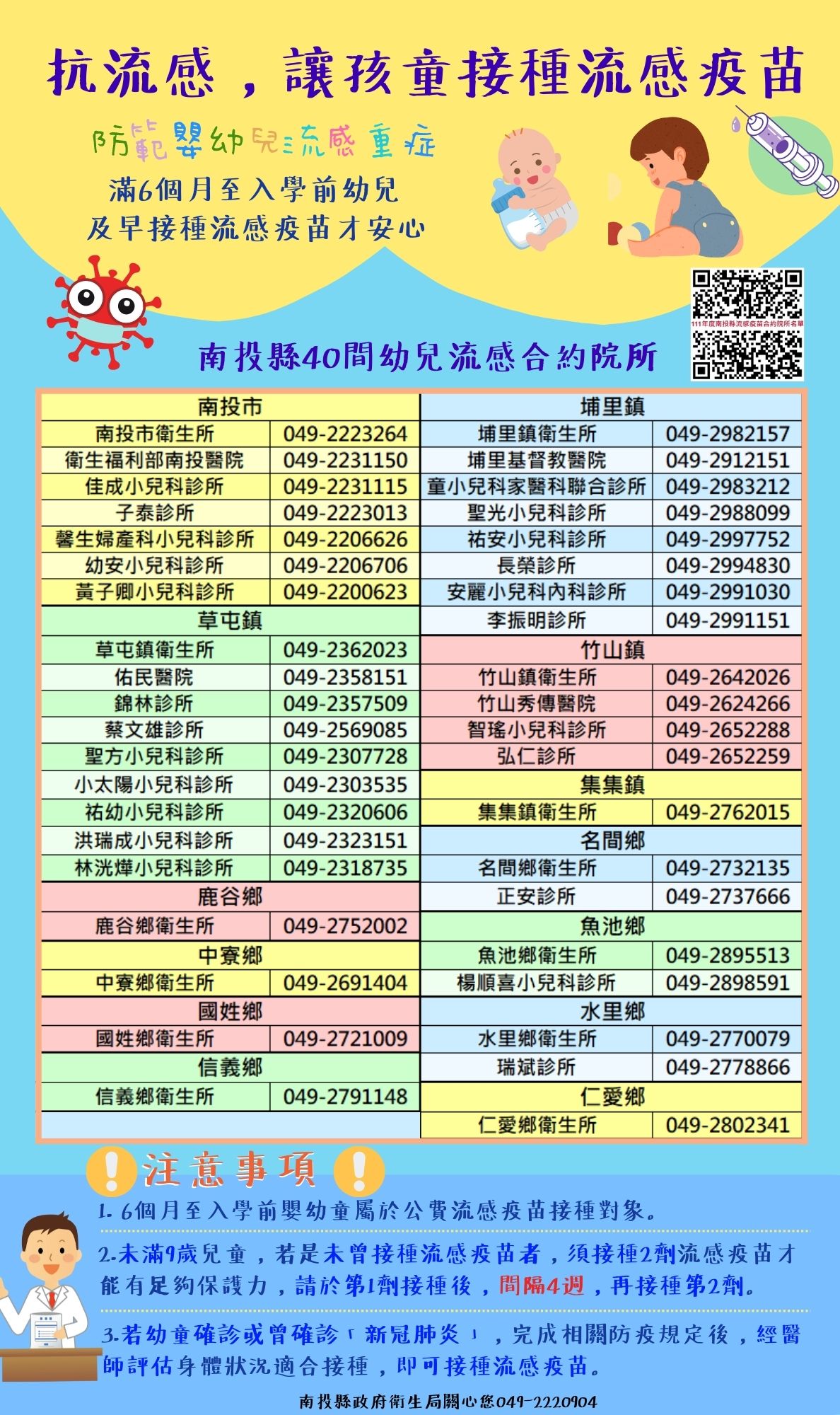 陳南松局長再次呼籲,近日呼吸道病毒肆虐,孩童多系統發炎症候群(MIS-C)與呼吸道融合症候群(RSV)個案皆有增加趨勢,請民眾務必注意,家中倘有滿6個月以上至入學前幼兒,請家長及早帶至合約院所接種流感疫苗,以防範嬰幼兒流感重症,請家長特別注意流感疫苗廠牌的接種年齡層:未滿3歲嬰幼兒,不得接種國光廠牌流感疫苗,本縣流感疫苗合約院所請逕至南投縣政府衛生局網站查詢https://reurl.cc/3YQO0l,也可洽詢各鄉鎮市衛生所或撥打本縣防疫專線049-2220904。