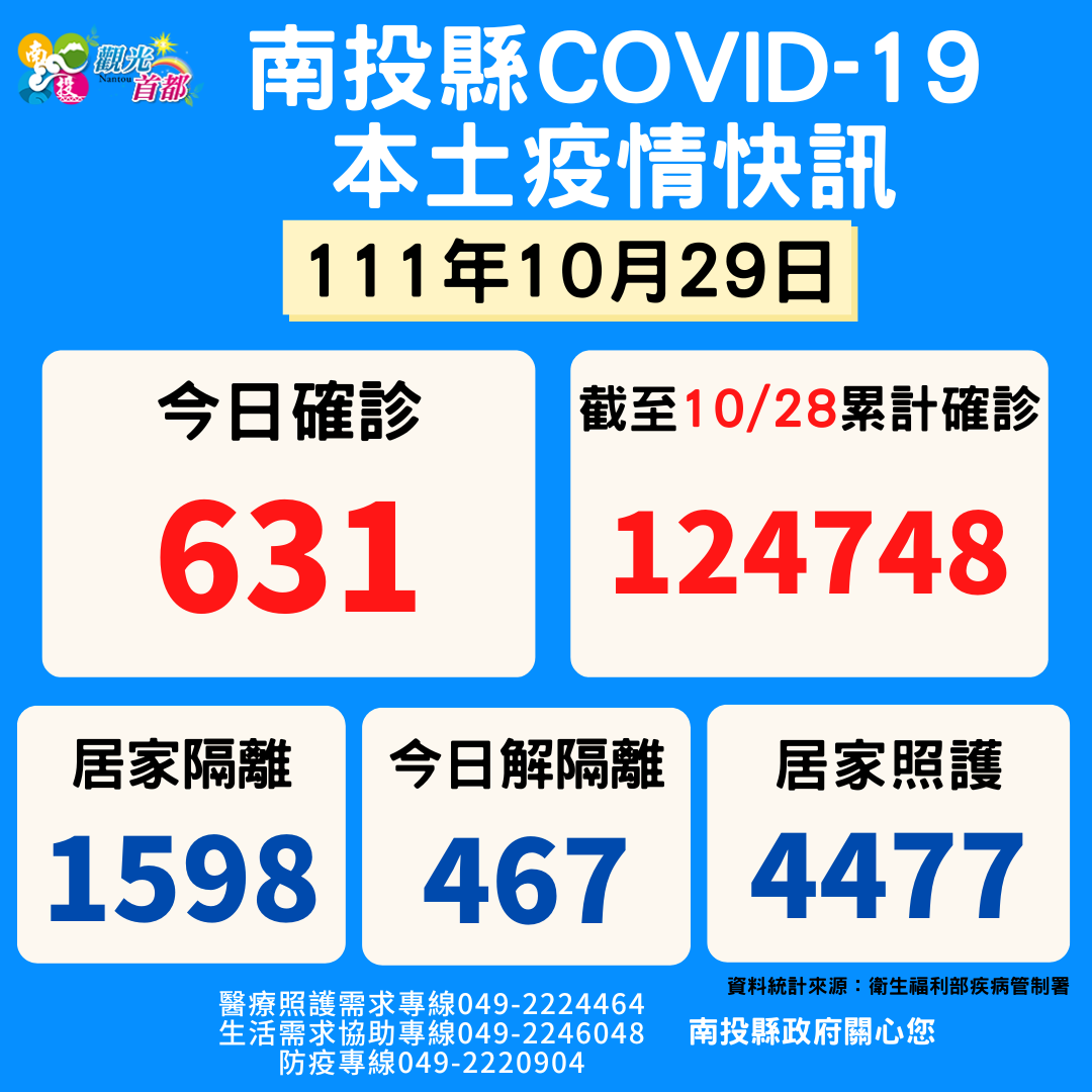 防疫宣傳 居家照護關懷手冊 防疫補助 勞工紓困 農漁畜牧 觀光紓困 企業紓困 租稅紓困 藝文紓困 中央各部會防疫專區 首頁 防疫宣傳 10/29南投縣疫情... 10/29南投縣疫情快訊 公佈單位:新聞及行政處 發佈日期:111/10/30