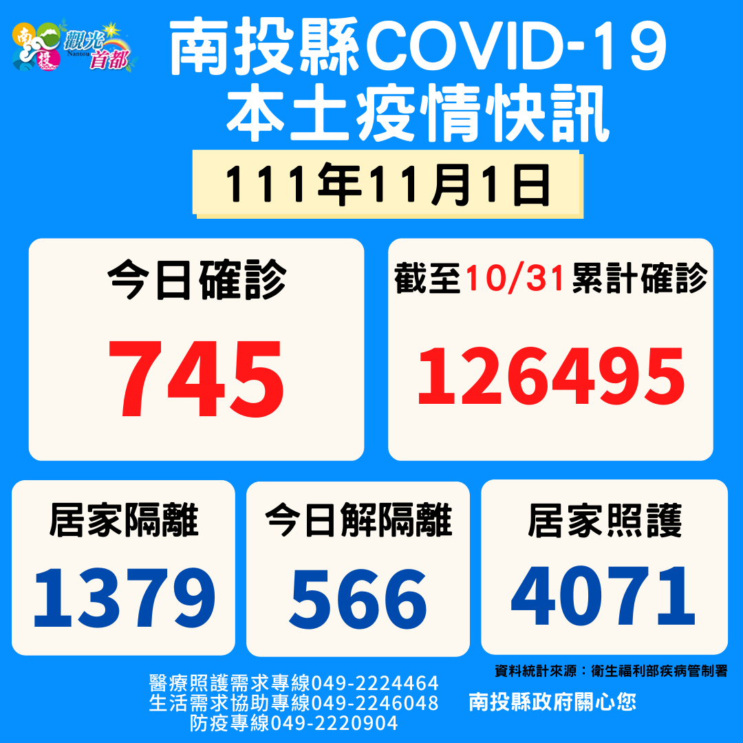 防疫宣傳 居家照護關懷手冊 防疫補助 勞工紓困 農漁畜牧 觀光紓困 企業紓困 租稅紓困 藝文紓困 中央各部會防疫專區 首頁 防疫宣傳 11月1日南投縣疫情... 11月1日南投縣疫情快訊 公佈單位:新聞及行政處 發佈日期:111/11/1