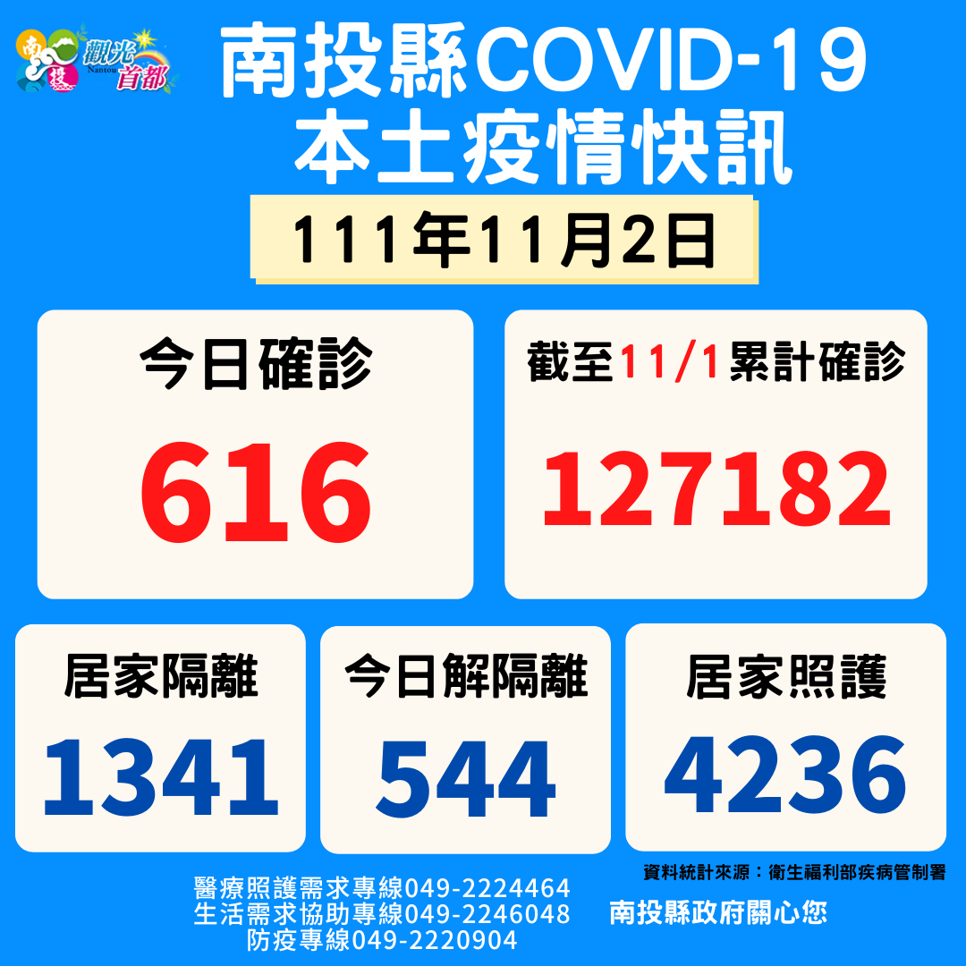防疫宣傳 居家照護關懷手冊 防疫補助 勞工紓困 農漁畜牧 觀光紓困 企業紓困 租稅紓困 藝文紓困 中央各部會防疫專區 首頁 防疫宣傳 11月2日南投縣疫情... 11月2日南投縣疫情快訊 公佈單位:新聞及行政處 發佈日期:111/11/2