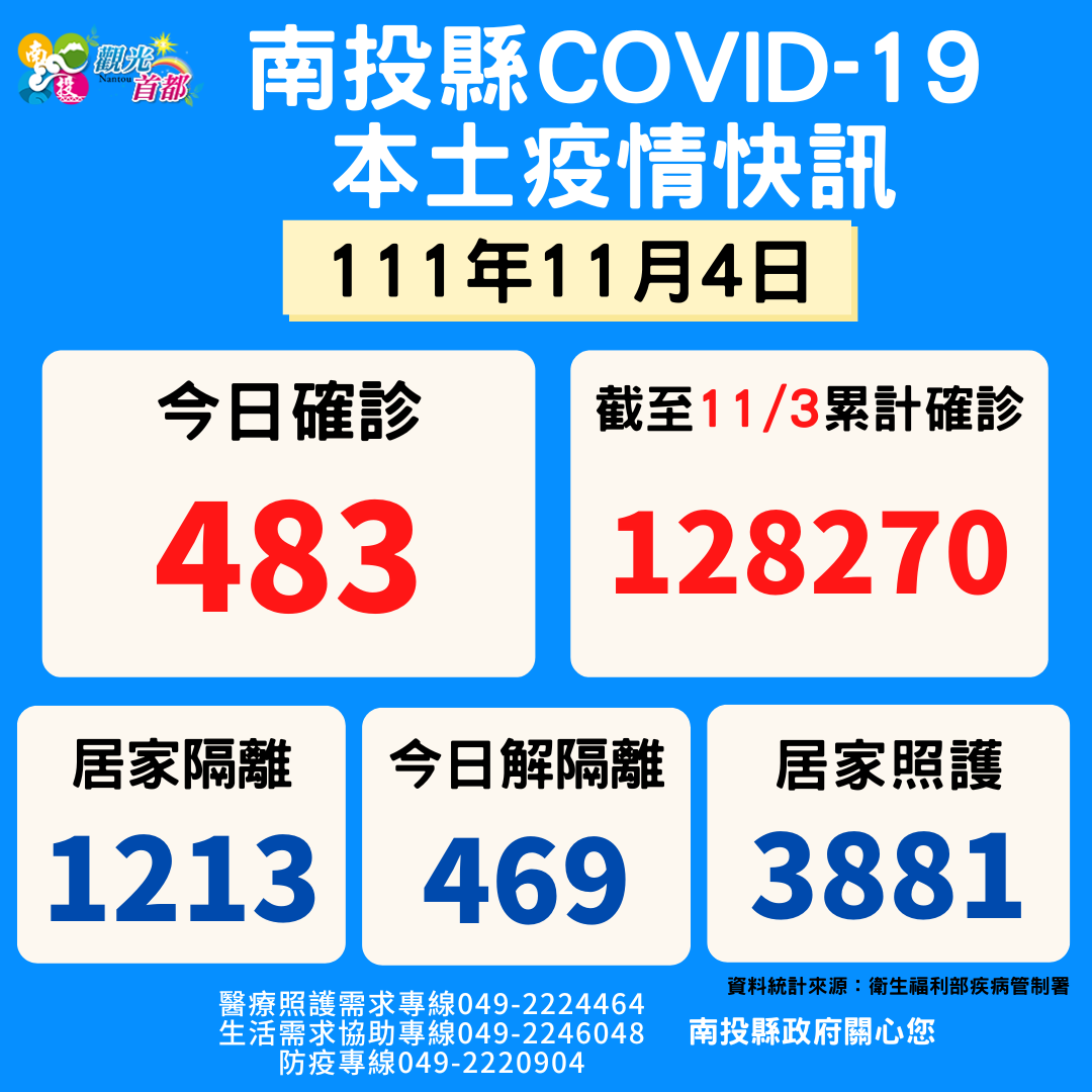 防疫宣傳 居家照護關懷手冊 防疫補助 勞工紓困 農漁畜牧 觀光紓困 企業紓困 租稅紓困 藝文紓困 中央各部會防疫專區 首頁 防疫宣傳 11/4南投縣疫情快... 11/4南投縣疫情快訊 公佈單位:新聞及行政處 發佈日期:111/11/4