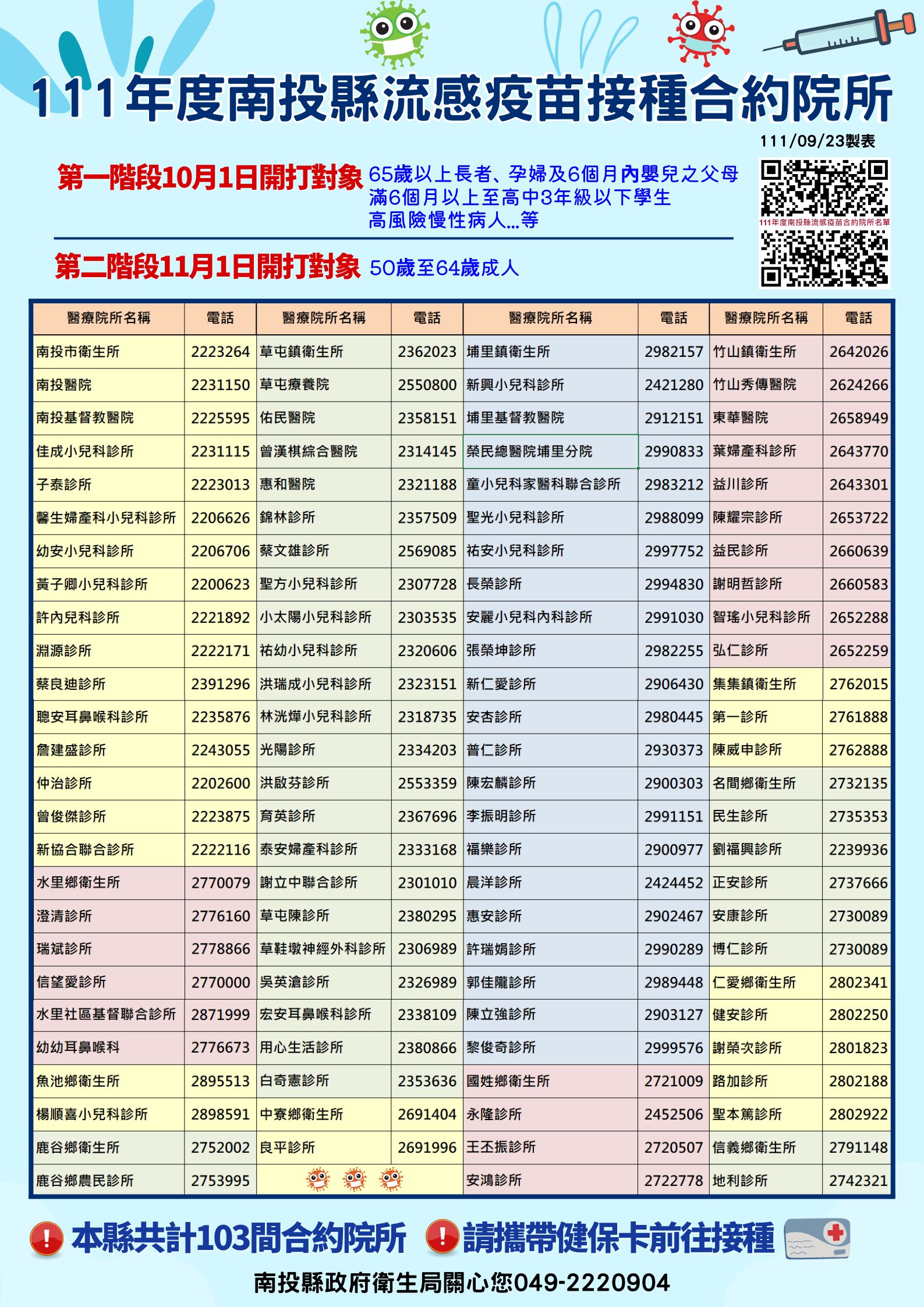 南投縣衛生局長陳南松說,接種疫苗後大約需1~2週才能產生保護力,流感疫苗跟新冠疫苗以「左流感,右新冠」方式,在左、右手臂同時接種兩種疫苗,身體產生保護力時就不會有空窗期,也可以節省您的時間,不用跑兩趟合約院所接種,本縣新冠疫苗合約院所詳見https://reurl.cc/RX723e