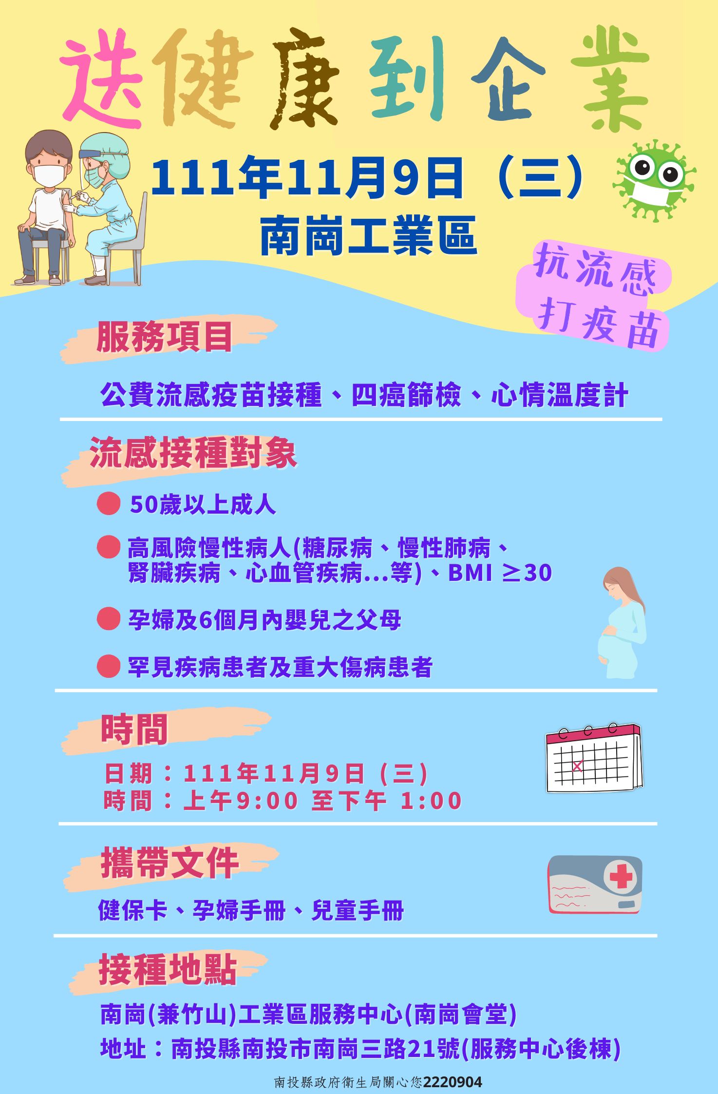 陳南松局長說,因秋冬為流感好發的季節,接種流感疫苗是預防流感最有效的方法,開放接種後請儘早接種,提升自我保護力,增強抵抗力,本縣明日(11/9)上午9時-13時於經濟部工業局南崗工業區服務中心(南崗會堂)及11月15日(星期二)下午2時-4時假經濟部工業局竹山工業區服務中心辦理,現場提供公費流感疫苗接種、四項癌症篩檢、心情溫度計(BSRS-5簡式健康量表)篩檢。