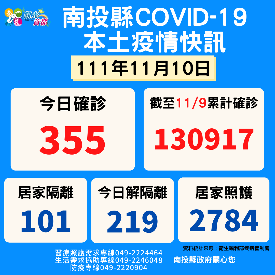 防疫宣傳 居家照護關懷手冊 防疫補助 勞工紓困 農漁畜牧 觀光紓困 企業紓困 租稅紓困 藝文紓困 中央各部會防疫專區 首頁 防疫宣傳 11月10日南投縣疫... 11月10日南投縣疫情快訊 公佈單位:新聞及行政處 發佈日期:111/11/10