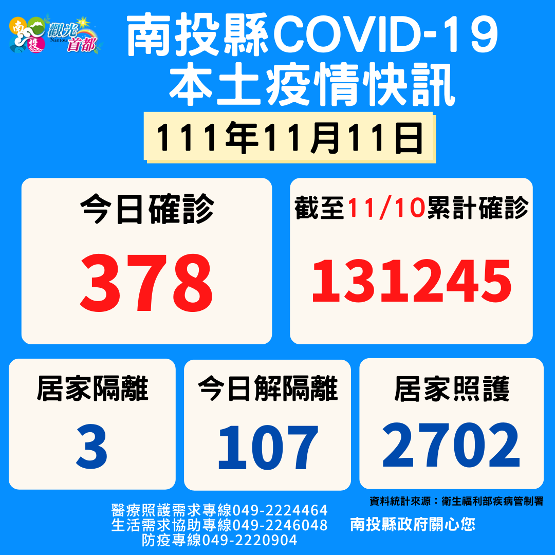 防疫宣傳 居家照護關懷手冊 防疫補助 勞工紓困 農漁畜牧 觀光紓困 企業紓困 租稅紓困 藝文紓困 中央各部會防疫專區 首頁 防疫宣傳 11月11日南投縣疫... 11月11日南投縣疫情快訊 公佈單位:新聞及行政處 發佈日期:111/11/11