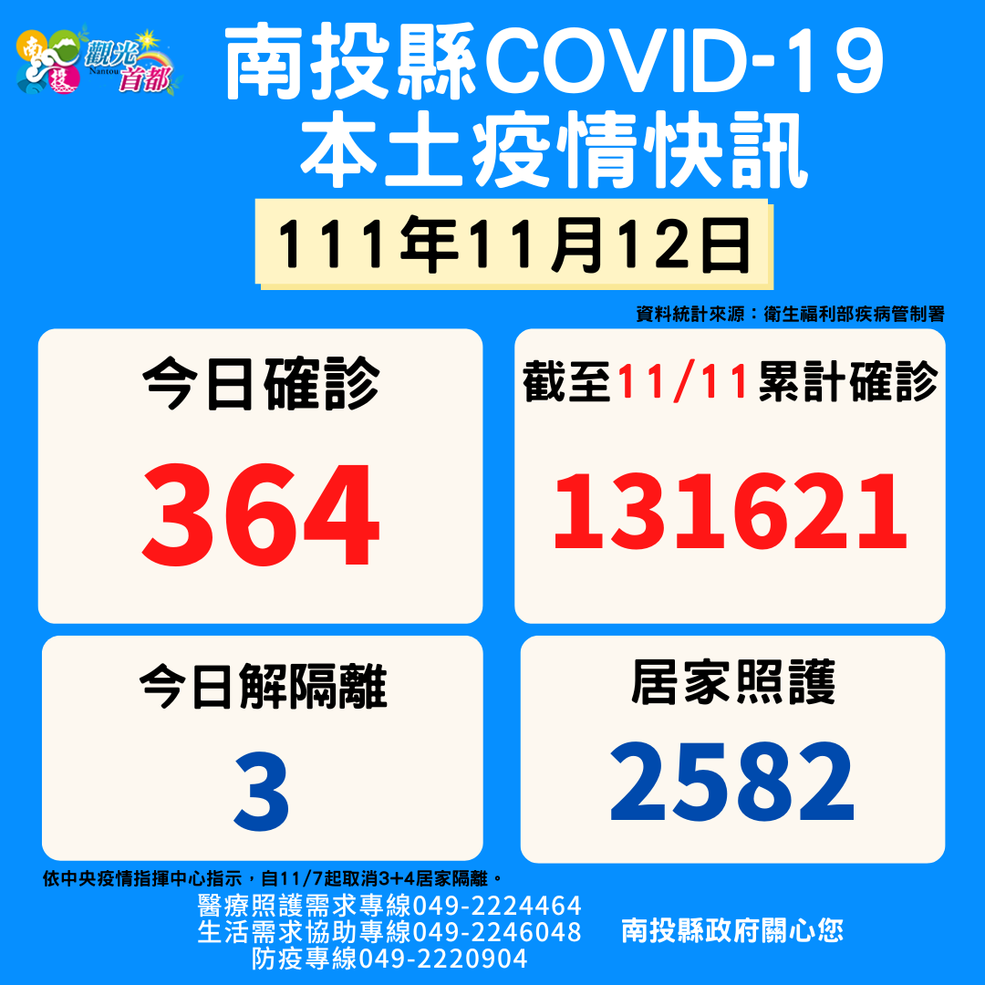 防疫宣傳 居家照護關懷手冊 防疫補助 勞工紓困 農漁畜牧 觀光紓困 企業紓困 租稅紓困 藝文紓困 中央各部會防疫專區 首頁 防疫宣傳 11月12日南投縣疫... 11月12日南投縣疫情快訊 公佈單位:新聞及行政處 發佈日期:111/11/14