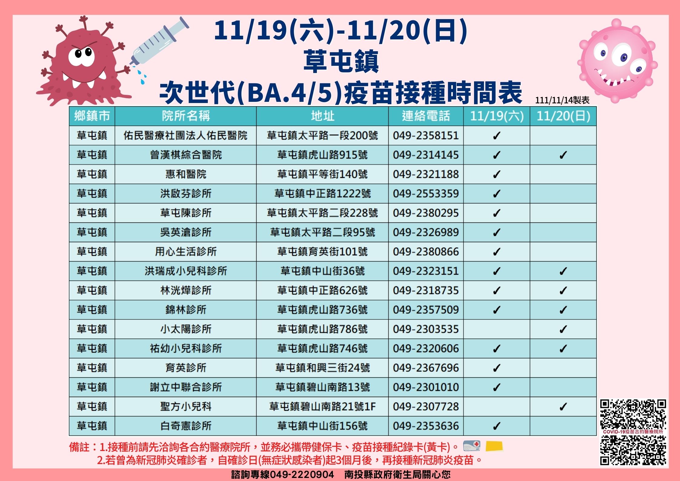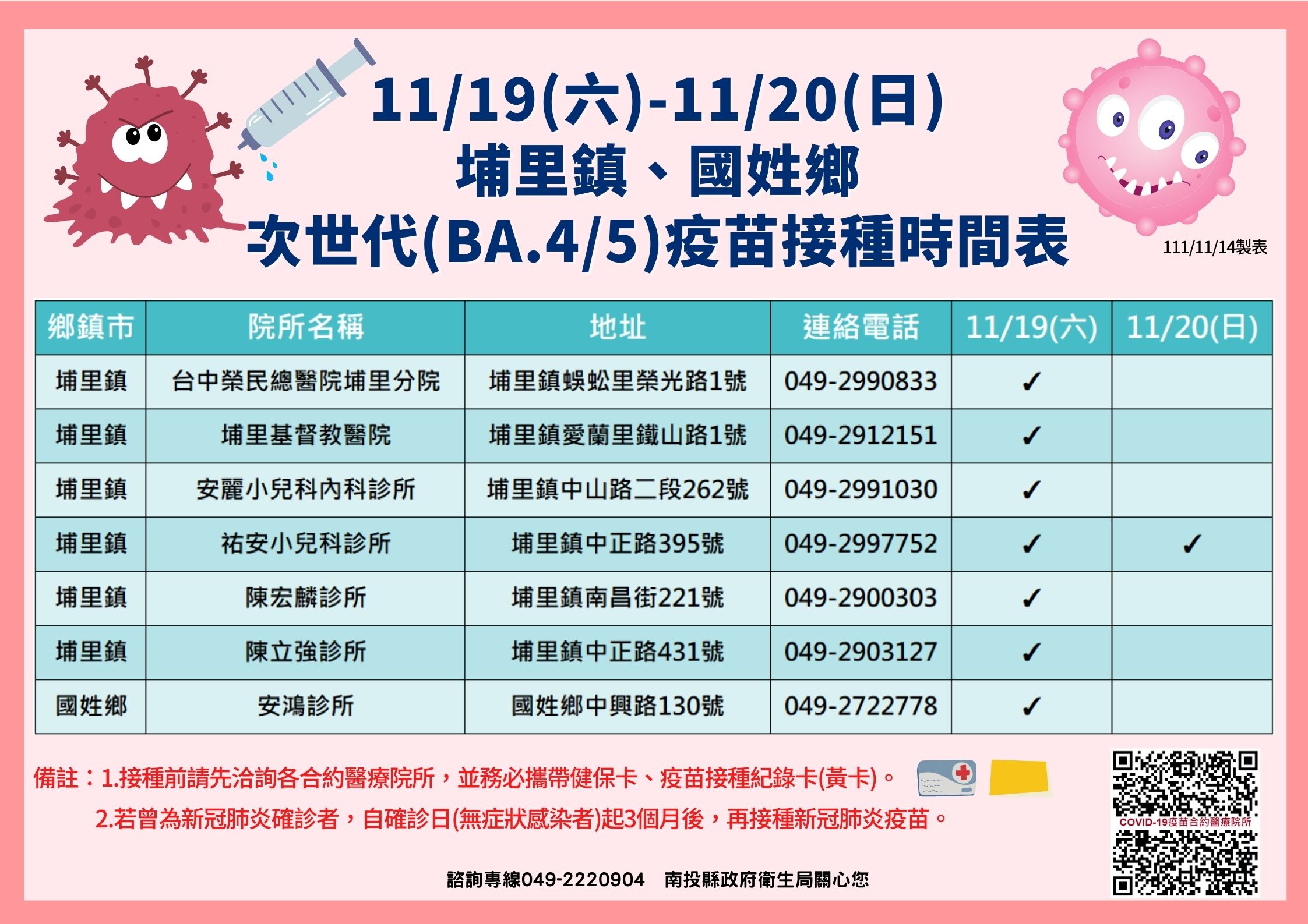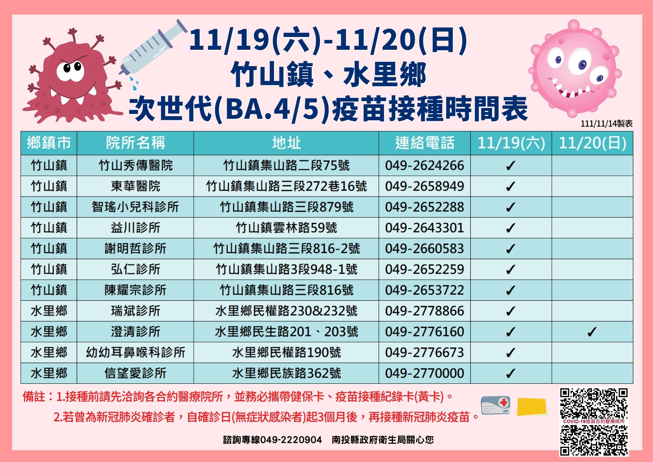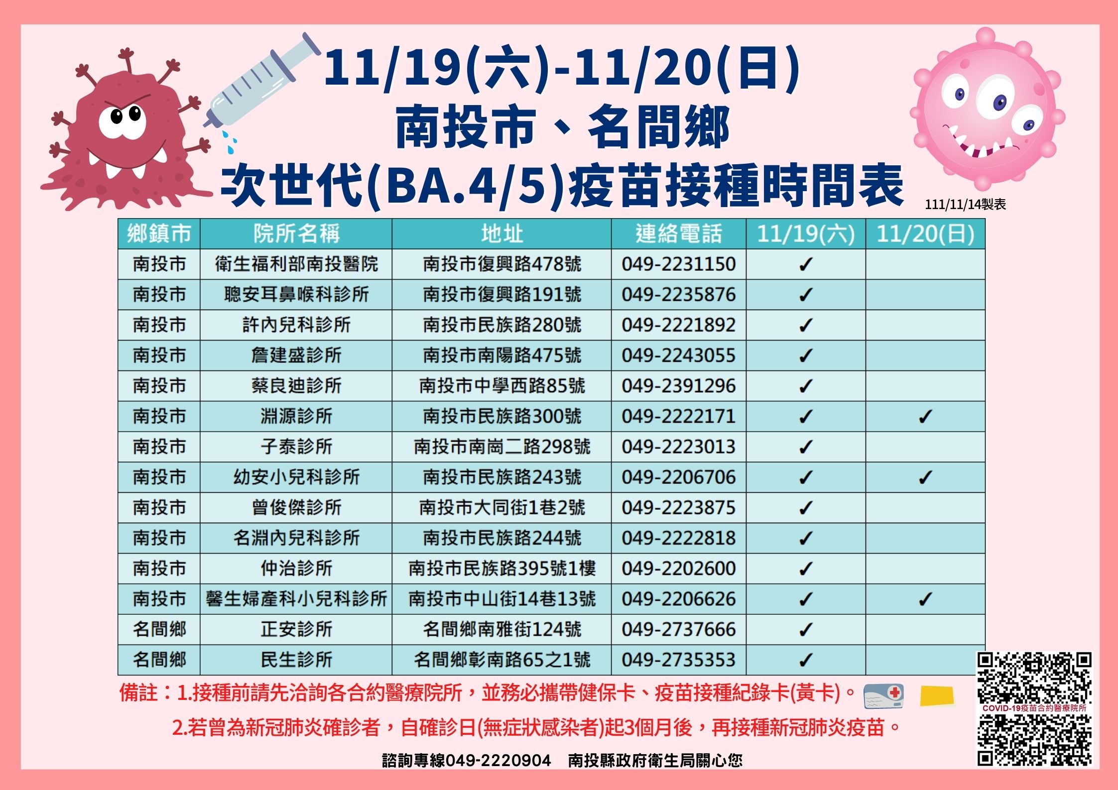 本土Omicron變異株主要以BA.5為主要感染病毒株,儘管國內疫情穩定可控但風險仍持續存在,而莫德納次世代BA.4/5疫苗含BA.5變異株抗原,對抗BA.5變異株具有較佳免疫反應,呼籲符合資格對象儘快完成接種。衛生局局長陳南松表示,指揮中心將於本週五(11/18)配送莫德納次世代疫苗BA.4/5約計1萬劑至本縣,並於當日配送至本縣85間合約院所。本週六(11/19)本縣將全面開放接種,同時於13鄉鎮開設接種站,提供平日因工作繁忙無法抽空至院所接種的民眾前往接種,也歡迎厝邊隔壁揪團一同參與,而當日無法抽空前往接種者,亦可至本縣合約院所接種,可逕洽合約醫療院所預約,或可至衛生局網站查詢(https://reurl.cc/aaGAKY)。