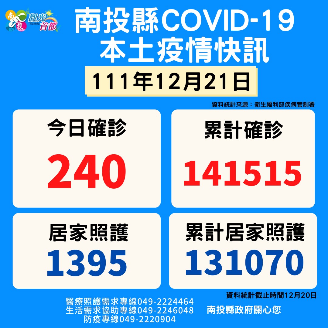 防疫宣傳 居家照護關懷手冊 防疫補助 勞工紓困 農漁畜牧 觀光紓困 企業紓困 租稅紓困 藝文紓困 中央各部會防疫專區 首頁 防疫宣傳 12月21日南投縣疫... 12月21日南投縣疫情快訊 公佈單位:新聞及行政處 發佈日期:111/12/21