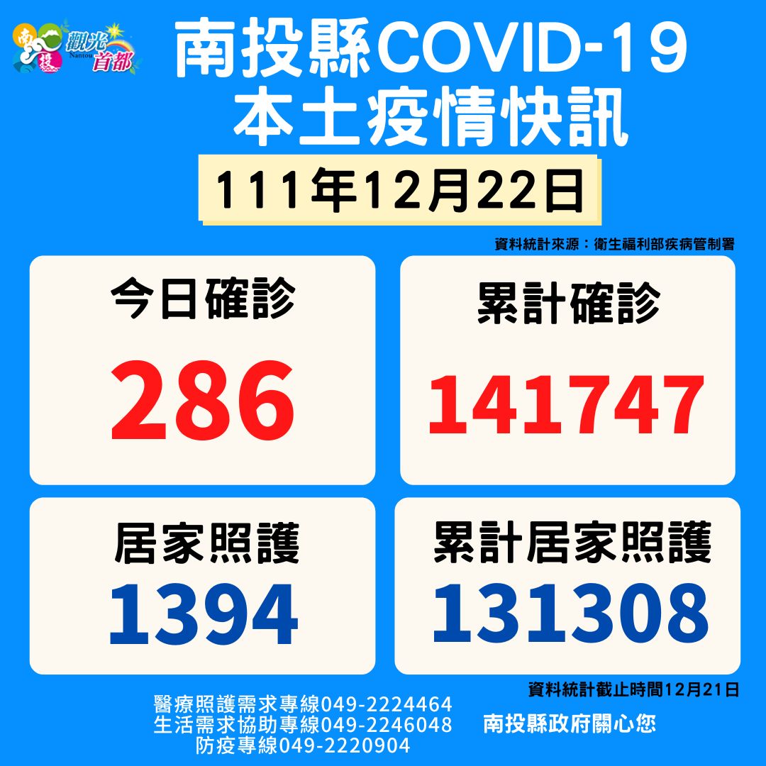 防疫宣傳 居家照護關懷手冊 防疫補助 勞工紓困 農漁畜牧 觀光紓困 企業紓困 租稅紓困 藝文紓困 中央各部會防疫專區 首頁 防疫宣傳 12月22日南投縣疫... 12月22日南投縣疫情快訊 公佈單位:新聞及行政處 發佈日期:111/12/22