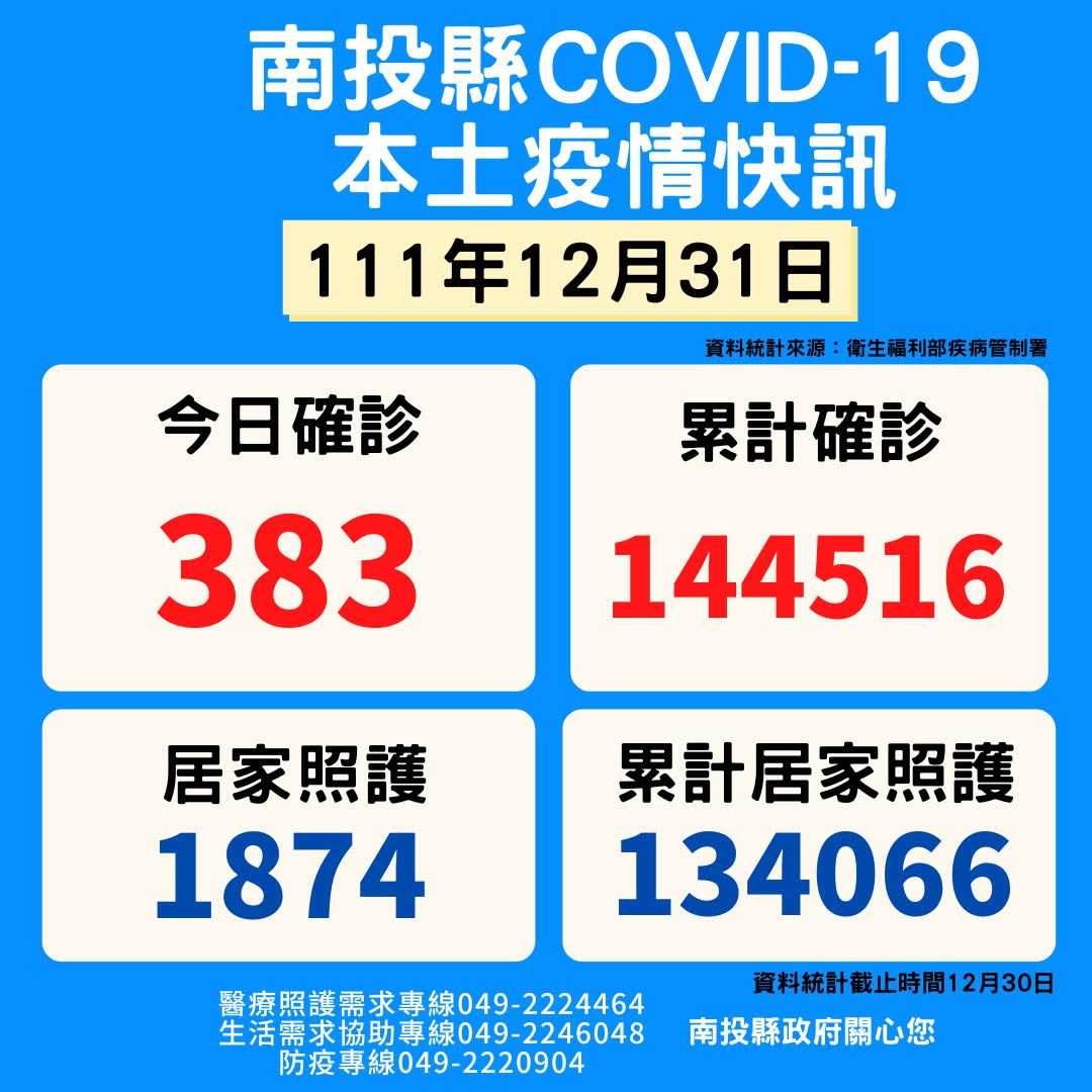 防疫宣傳 居家照護關懷手冊 防疫補助 勞工紓困 農漁畜牧 觀光紓困 企業紓困 租稅紓困 藝文紓困 中央各部會防疫專區 首頁 防疫宣傳 12月31日南投縣疫... 12月31日南投縣疫情快訊 公佈單位:新聞及行政處 發佈日期:112/1/2