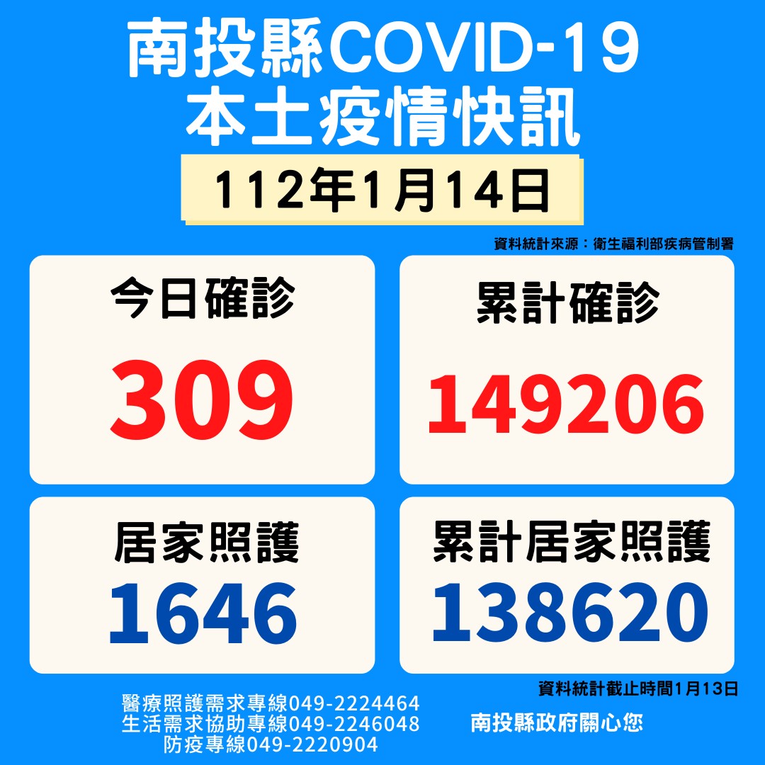 防疫宣傳 居家照護關懷手冊 防疫補助 勞工紓困 農漁畜牧 觀光紓困 企業紓困 租稅紓困 藝文紓困 中央各部會防疫專區 首頁 防疫宣傳 01月14日南投縣疫... 01月14日南投縣疫情快訊 公佈單位:新聞及行政處 發佈日期:112/1/16