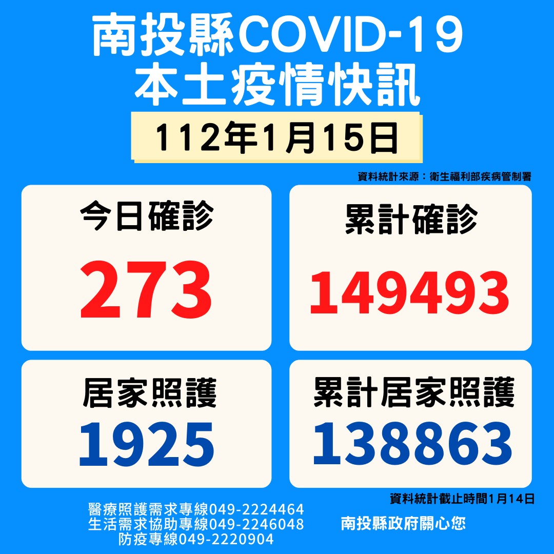 防疫宣傳 居家照護關懷手冊 防疫補助 勞工紓困 農漁畜牧 觀光紓困 企業紓困 租稅紓困 藝文紓困 中央各部會防疫專區 首頁 防疫宣傳 01月15日南投縣疫... 01月15日南投縣疫情快訊 公佈單位:新聞及行政處 發佈日期:112/1/16