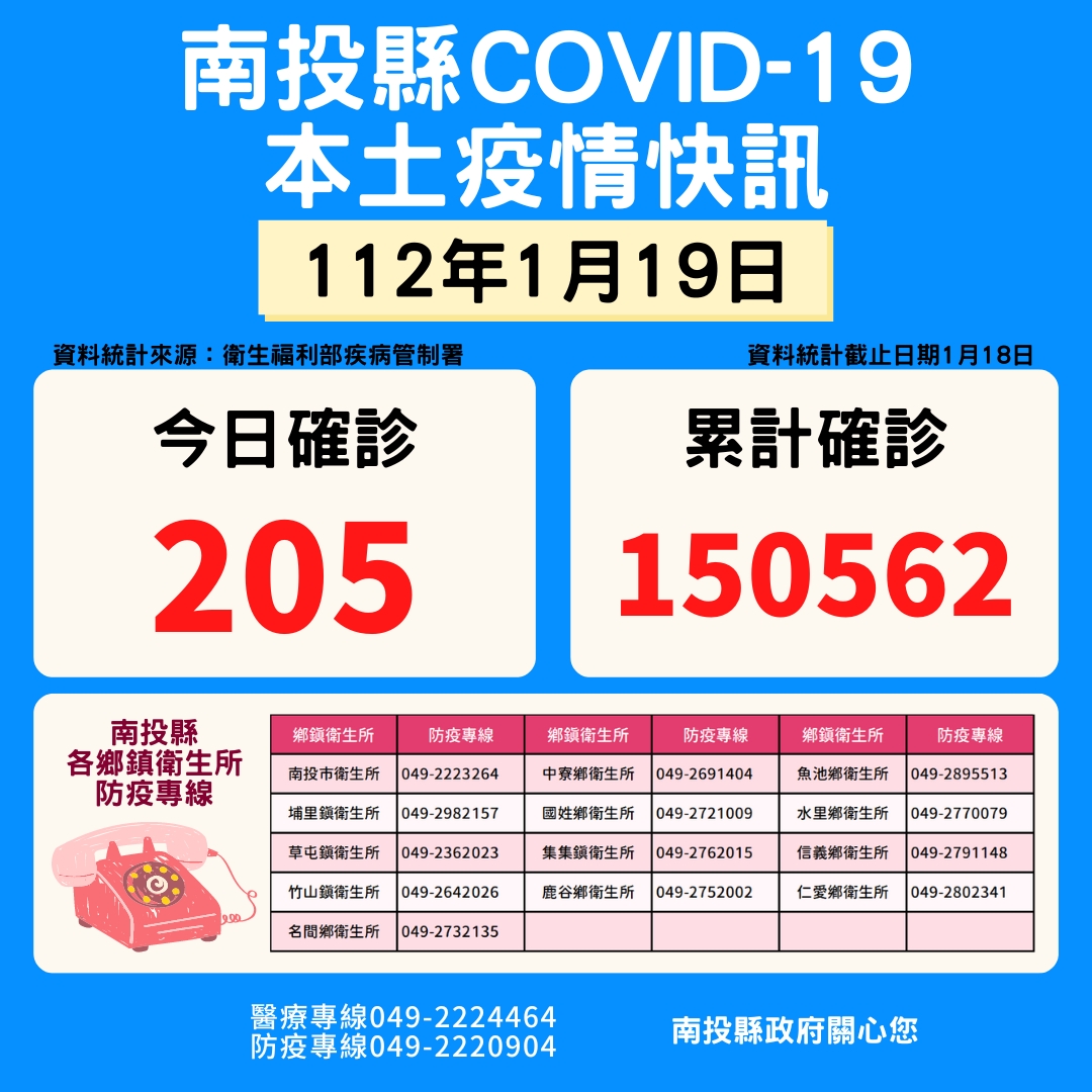 防疫宣傳 居家照護關懷手冊 防疫補助 勞工紓困 農漁畜牧 觀光紓困 企業紓困 租稅紓困 藝文紓困 中央各部會防疫專區 首頁 防疫宣傳 01月19日南投縣疫... 01月19日南投縣疫情快訊 公佈單位:新聞及行政處 發佈日期:112/1/19