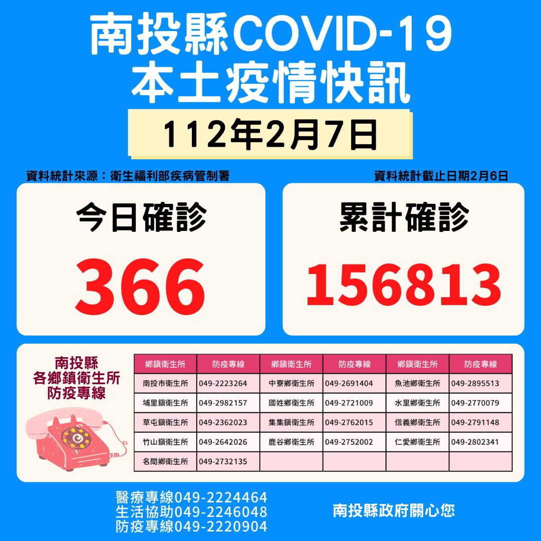 防疫宣傳 居家照護關懷手冊 防疫補助 勞工紓困 農漁畜牧 觀光紓困 企業紓困 租稅紓困 藝文紓困 中央各部會防疫專區 首頁 防疫宣傳 2月7日南投縣疫情快... 2月7日南投縣疫情快訊 公佈單位:新聞及行政處 發佈日期:112/2/7