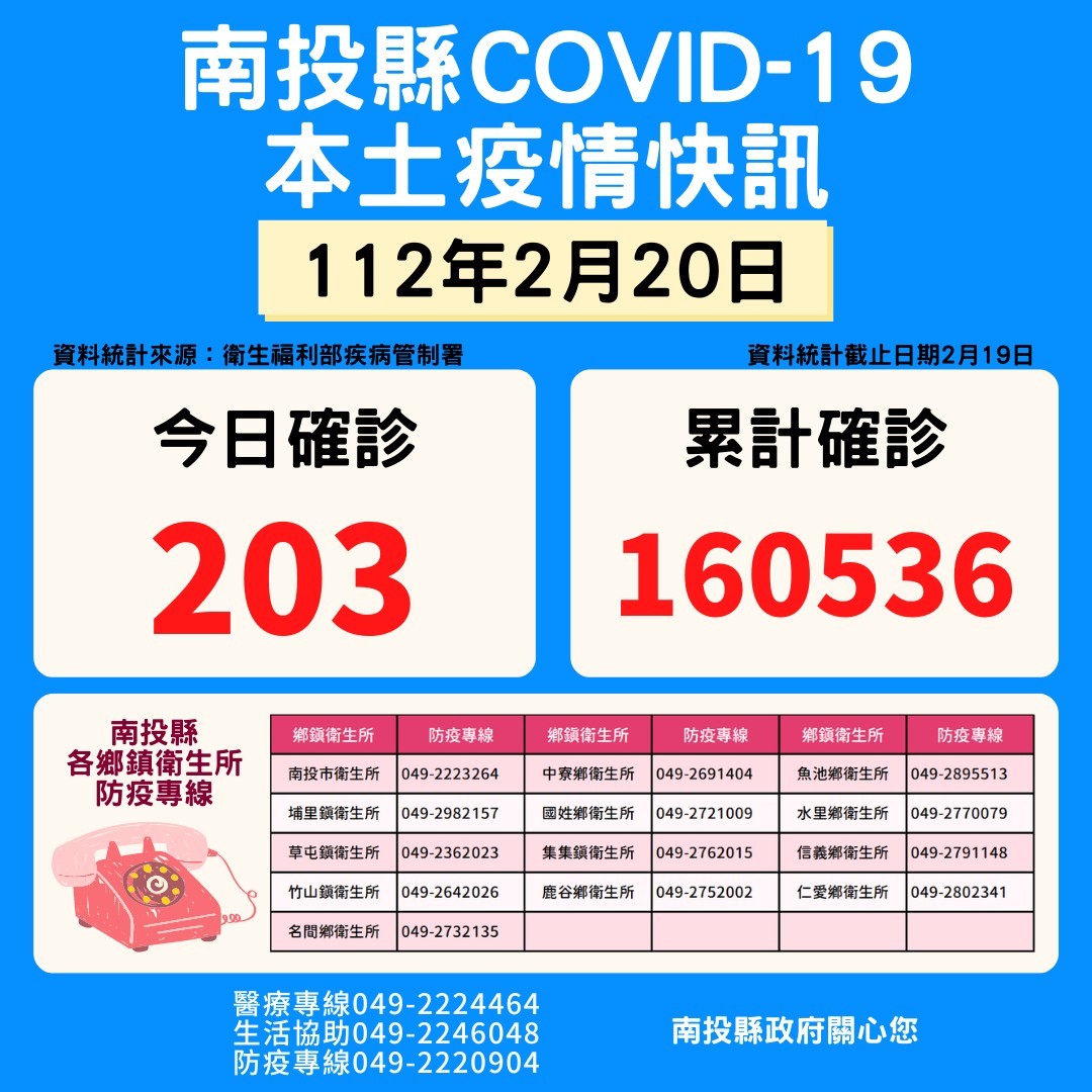 防疫宣傳 居家照護關懷手冊 防疫補助 勞工紓困 農漁畜牧 觀光紓困 企業紓困 租稅紓困 藝文紓困 中央各部會防疫專區 首頁 防疫宣傳 2月20日南投縣疫情... 2月20日南投縣疫情快訊 公佈單位:新聞及行政處 發佈日期:112/2/20