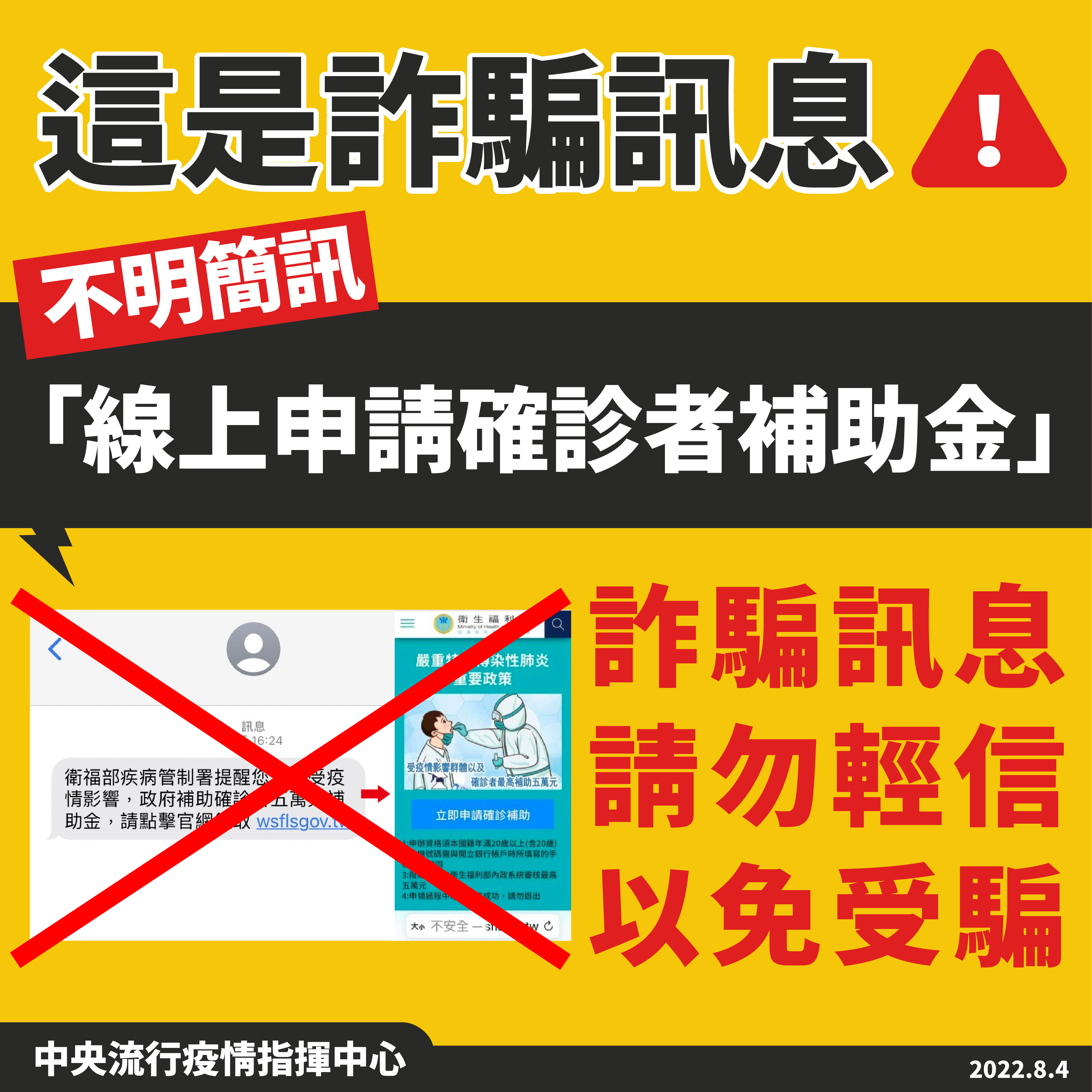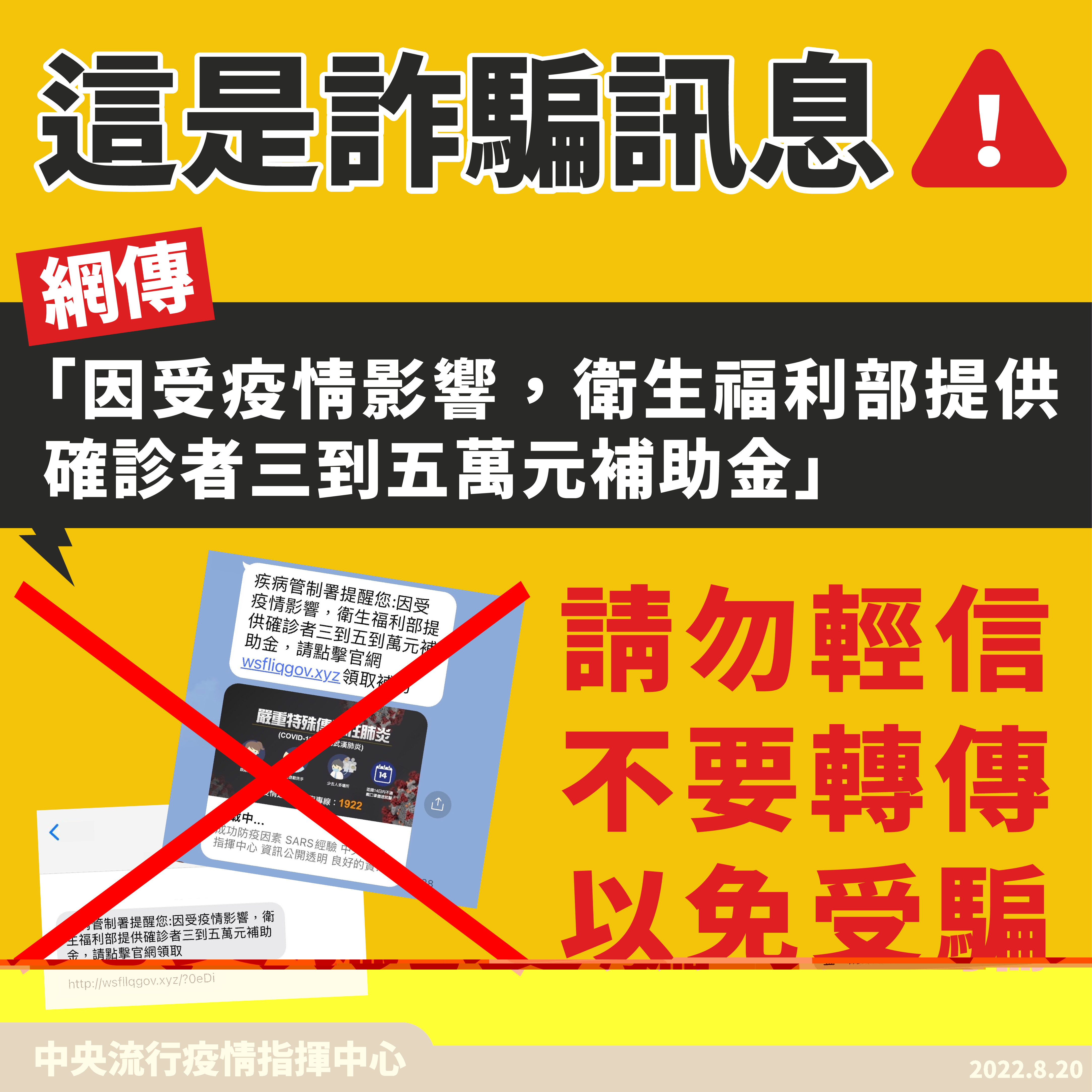 近期流傳之不明訊息,透過簡訊、郵件、Apple之iMessage及Line發送,以「因受疫情影響,衛生福利部提供確診者三到五萬元補助金」、「衛福部提供確診者補助金」相關詞彙製作釣魚連結。並假冒疾病管制署名義,誘導民眾於訊息中網址輸入個資等。衛福部澄清,疾病管制署官方並無發布此訊息,籲請民眾提高警覺,勿點擊不明來源連結,不要輕易於網站上填寫個人資料,避免權益受損。若有疑慮可利用刑事警察局165反詐騙諮詢專線查證。民眾如欲線上申辦衛福部防疫補償,請至專區查詢 (網址:https://swis.mohw.gov.tw/covidweb/ );有關今(2022)年最新疫情紓困政策,請民眾至行政院1988專區查詢 (網址:https://1988.taiwan.gov.tw/ )。